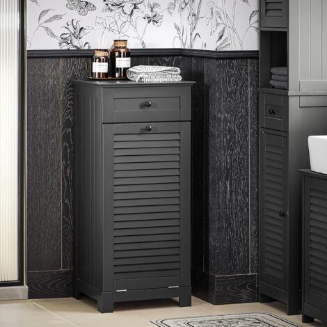 Ordnung im Bad war noch nie so schön! Diese SoBuy Badkommode im modernen Dunkelgrau ist ein echter Hingucker und bietet jede Menge Stauraum. Mit 69cm Breite, 80cm Höhe und 33cm Tiefe passt sie perfekt in jedes Badezimmer. Hinter den zwei Türen versteckst du Handtücher, Putzmittel oder Beauty-Produkte, während das offene Fach für dekorative Accessoires oder oft genutzte Dinge bereitsteht. Das Besondere: Du bekommst die Knöpfe in zwei Farben - Silber und Bronze - und kannst so den Look immer mal wieder ändern. Aus robustem MDF Material lackiert, trägt die Kommode bis zu 90kg und wiegt selbst nur 17,5kg. Perfekt nicht nur fürs Bad, sondern auch für Flur, Wohnzimmer oder als Sideboard in der Küche. Als Teil eines 4-teiligen Bad-Sets erhältlich, aber auch solo ein absoluter Blickfang. Deutsche Qualität von SoBuy - für mehr Ordnung und Stil in deinem Zuhause!