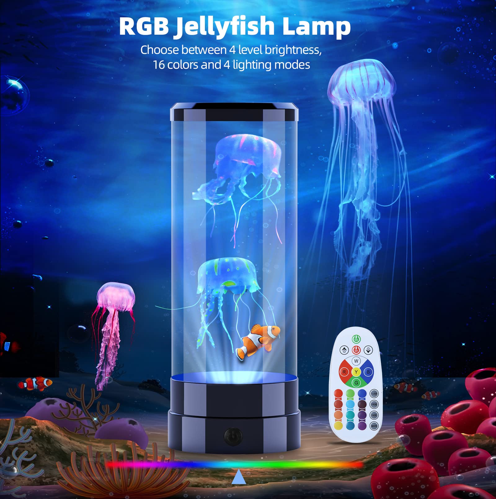 Einfach hypnotisierend! Diese Soarling Quallen Lampe bringt die Ruhe des Ozeans in dein Zuhause. Die Quallen schwimmen lebensecht im Wasser und werden von 6 LED-Leuchten in 17 Farben beleuchtet. 4 Lichtmodi stehen zur Wahl: Blitz, Stroboskop, Überblendung und Sanft. Per Fernbedienung steuerbar, mit 3 Helligkeitsstufen. Der geräuscharme Motor sorgt für entspannte Atmosphäre - perfekt als Nachtlicht oder zum Abschalten nach der Arbeit. Einfach mit Wasser und etwas Spülmittel befüllen, schon tanzen die Quallen. Ideal fürs Schlafzimmer, Wohnzimmer oder als besonderes Geschenk. Hilft bei Stressabbau und sorgt für magische Stimmung bei jeder Party. Einfach faszinierend!