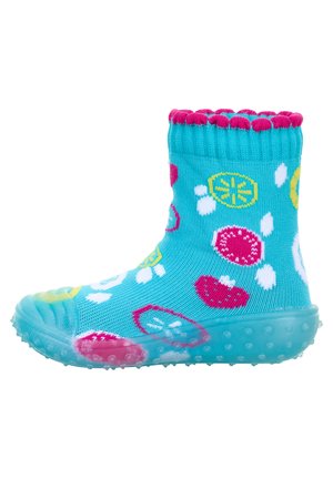 So süß! Diese Adventure-Socks von Sterntaler sind die perfekte Kombi aus Socke und Schuh für deine Kleine. Mit der transparenten Gummisohle mit Noppen gibt's rutschfesten Halt - ob im Haus, Garten oder am Wasser! Das niedliche Früchte-Motiv bringt gute Laune und der Bademodenstoff trocknet super schnell. 93% Polyamid, 4% Elasthan und 3% Polyester machen die Socken schön elastisch und bequem. Die Sohle aus thermoplastischem Gummi schützt vor scharfen Gegenständen am Boden. Einfach per Hand waschen und schon sind sie wieder ready fürs nächste Abenteuer! Perfekt für Krabbelkinder, die die Welt entdecken wollen. In hübscher Sterntaler-Qualität - da weißt du, dass dein Kind gut angezogen ist!