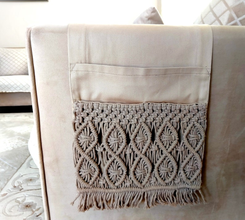Total praktischer Sofa-Organizer im trendigen Macrame-Look! In beige passt er zu jedem Einrichtungsstil. Mit 4 Taschen für Fernbedienungen, Handy, Zeitschriften, Bücher - alles griffbereit. Einfach über die Armlehne hängen, das Ende unter das Kissen schieben - fertig! Rutschfeste Partikel halten ihn sicher an Ort und Stelle. Auch super fürs Bett geeignet. Aus hochwertiger Baumwolle handgefertigt - 89cm lang, 33cm breit. Macht dein Wohnzimmer sofort aufgeräumter und gemütlicher!