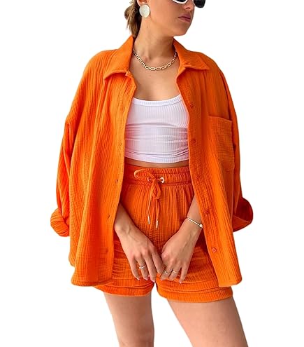 Perfekt für heiße Sommertage! Dieses lässige Zweiteiler-Set aus weichem Musselin besteht aus einer oversized Langarm-Bluse und einer bequemen Shorts. Der Stoff? Super leicht, luftig und atmungsaktiv - hält dich auch bei Hitze angenehm kühl. Die Shorts hat praktische Taschen, verstellbaren Kordelzug und elastischen Bund für perfekten Sitz. Die Bluse mit Knopfleiste und Taschen ist vielseitig kombinierbar - ob mit Crop-Top, Sport-BH oder solo. Perfekt als Lounge-Wear zu Hause, aber auch stylisch genug für Unterwegs, Strandurlaub oder Stadtbummel. Einfach kombinieren mit flachen Sandalen - schon hast du den perfekten Sommer-Look! Das Set kommt ohne das abgebildete Tanktop - aber das hast du ja sicher schon im Schrank. Für alle, die es bequem und trotzdem stylisch mögen - ob junges Mädchen oder erwachsene Frau.