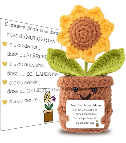 Kleine Sonnenblume - große Wirkung! Dieser handgehäkelte Pocket Hug passt in jede Tasche und bringt überall gute Laune mit. Aus weicher Wolle gehäkelt - super weich und kuschelig! Mit ca. 15,5x5cm perfekt für unterwegs. Inklusive süßer Karte mit aufbauender Nachricht - ideal als Mutmacher! Ob für Prüfungen, schwere Tage oder einfach so - diese Sonnenblume gibt positive Energie. Perfekt als Geschenk für Freunde, Familie oder dich selbst! Einfach in die Tasche stecken und bei Bedarf drücken - sofort fühlst du dich besser. Mach dir oder anderen eine Freude mit diesem kleinen Strahlemann!