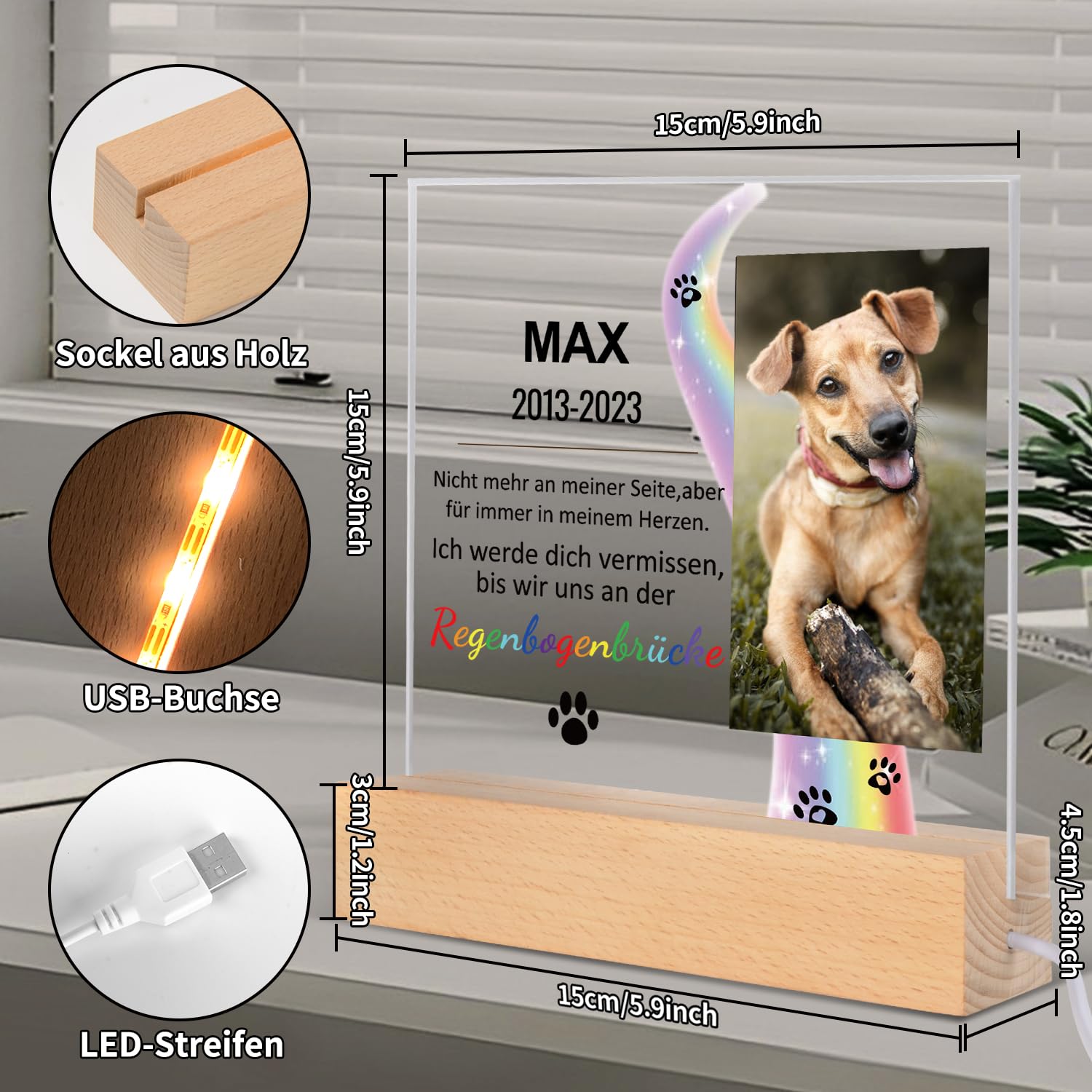 Wenn ein geliebtes Haustier über die Regenbogenbrücke geht, hinterlässt es eine Lücke im Herzen. Dieser wunderschöne Sonnenfänger ist ein tröstliches Andenken, um deinen vierbeinigen Freund in Ehren zu halten. Hergestellt aus hochwertigem K9-Kristall, erzeugt er im Sonnenlicht bezaubernde Regenbogenreflexionen, die den Raum mit Trost und Frieden erfüllen. Mit einer lasergravierten Edelstahlscheibe, Kristallperlen und einem Herzanhänger ist er nicht nur dekorativ, sondern auch symbolträchtig. Perfekt für Fenster, Garten oder Balkon - überall dort, wo das Sonnenlicht hinfällt. Ein einfühlsames Geschenk für Tierfreunde in Trauer oder für dich selbst, um die Erinnerung an deinen tierischen Begleiter lebendig zu halten. Die Regenbogenbrücke symbolisiert die Verbindung zwischen den Welten - ein tröstlicher Gedanke in schweren Zeiten.