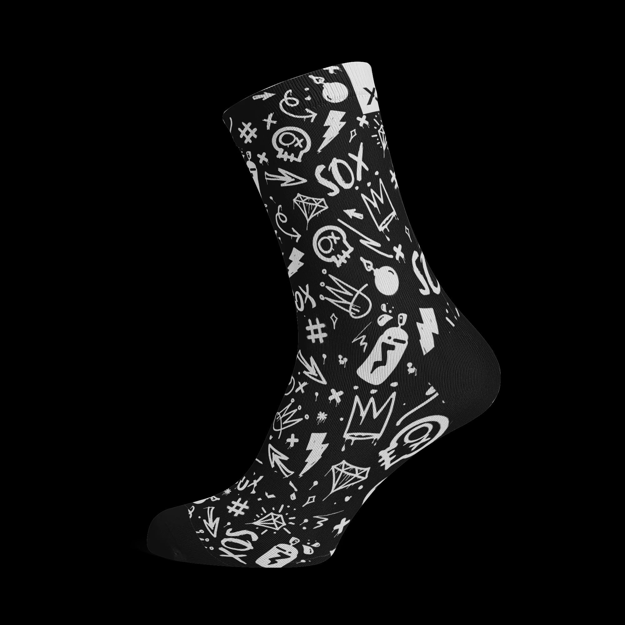 Coole Socken mit Attitude! Diese Sox Doodle Socken im Graffiti-Design mit Punk-Rock-Symbolen wie Totenköpfen, Diamanten und Kronen auf schwarzem Grund sind einfach der Hit. Aus 61% Polyester, 19% Spandex und 20% Elastane für perfekten Sitz. Die moderate Kompression unterstützt die Durchblutung und reduziert Ermüdung - perfekt für Sport und Alltag. Mit verstärkter Zehen- und Fersenpartie für extra Haltbarkeit und die nahtlose Zehe verhindert Blasenbildung. Der Y-förmige Fersenbereich sorgt für optimalen Sitz ohne Verrutschen. Die 16 cm hohe Bündchen passen zu jeder Kleidung. Mit HTFU-Technologie und wiederverwendbarer Verpackung inklusive praktischem Utility Bag. Perfekt für Laufen, Radfahren, Wandern oder einfach als stylischer Alltagsbegleiter. Einfach anziehen und durchstarten!