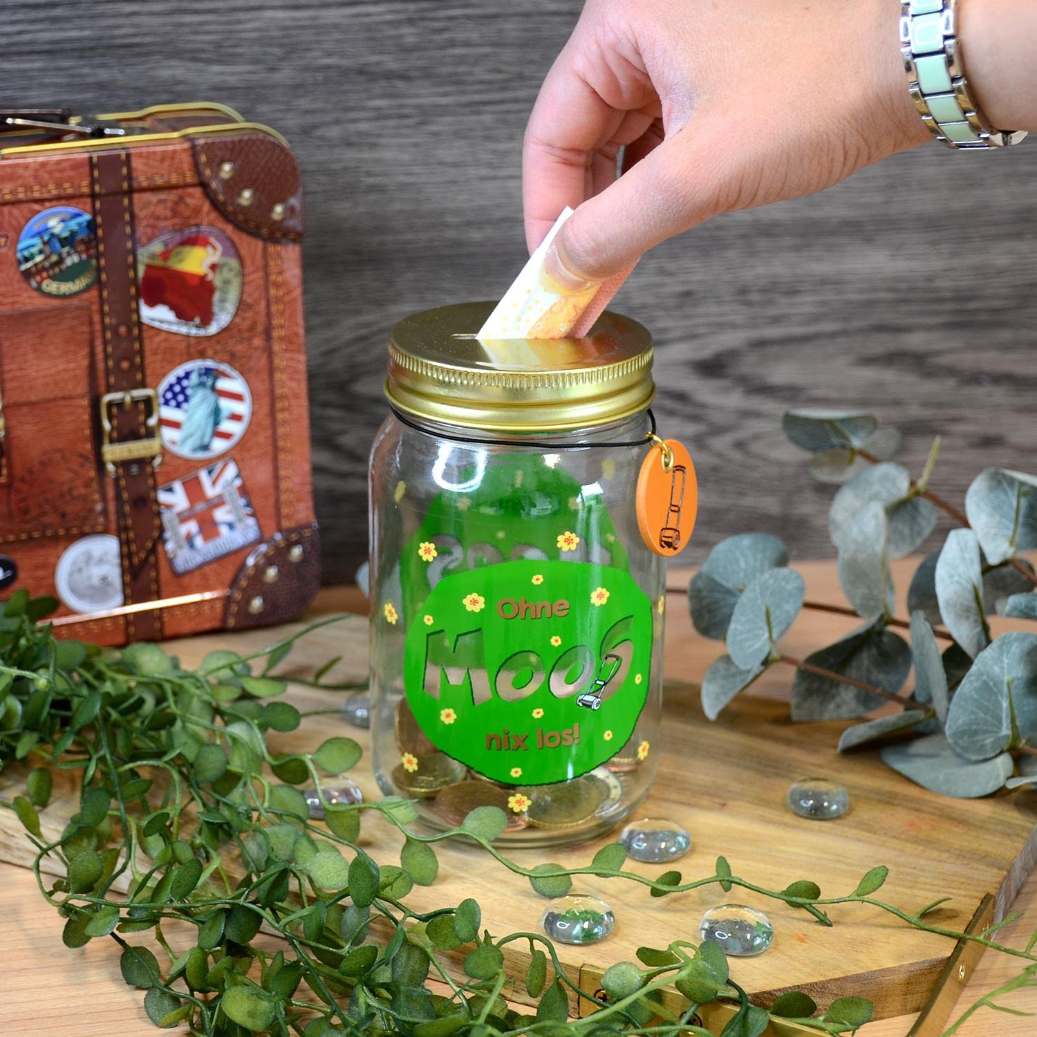 Diese süße Spardose von GRUSS & CO ist einfach niedlich! Aus stabilem Glas mit dem lustigen Spruch 'Ohne Moos nix los' - perfekt um Kleingeld zu sammeln oder als originelle Verpackung für Geldgeschenke. Mit 13,8cm Höhe und 8cm Durchmesser hat sie die ideale Größe für die Fensterbank oder den Schreibtisch. Der Metalldeckel mit Münzeinwurf sorgt dafür, dass dein Erspartes sicher verwahrt ist. Das bunte Moos-Motiv bringt Fröhlichkeit in jeden Raum. Super als Geschenk zur bestandenen Prüfung, zur Hochzeit oder einfach so - weil Sparen auch Spaß machen kann! Von SHEEPWORLD in Bayern liebevoll designed. Ein echter Hingucker, der nicht nur praktisch ist, sondern auch noch gut aussieht!