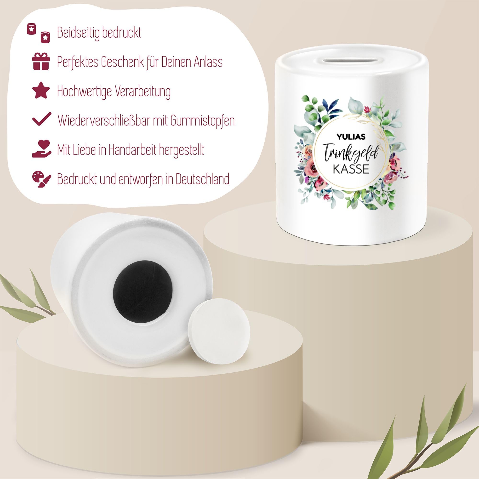 Die perfekte Geschenkidee für jeden Anlass! Diese hochwertige Keramik-Spardose kannst du mit jedem Namen personalisieren lassen. Mit 95mm Höhe und 80mm Durchmesser (330ml Volumen) ist sie ideal für Münzen und kleine Scheine. Hergestellt im Schwarzwald mit hochwertigem Sublimationdruck der waschfest und langlebig ist. Perfekt für Kommunion, Konfirmation, Geburtstage oder als originelles Geldgeschenk. Einfach den gewünschten Namen angeben und wir drucken ihn individuell auf. Auch in größeren Mengen erhältlich. Mach deinem Liebling eine Freude mit dieser persönlichen Spardose!