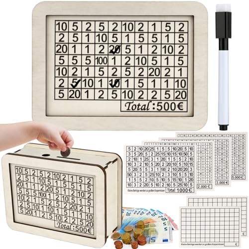 Endlich macht Sparen richtig Spaß! Diese Holz-Spardose mit Sparziel-Anzeige ist nicht nur praktisch, sondern auch total motivierend. Du kannst dein Sparziel direkt auf die Box schreiben und dann nach und nach die Zahlen ankreuzen, wenn du Geld einwirfst. So siehst du immer genau, wie nah du deinem Ziel schon bist - ob für den Führerschein, den nächsten Urlaub oder einfach als Notgroschen. Aus hochwertigem, umweltfreundlichem Holz gefertigt, ist sie robust und langlebig. Das coole Feature: Sie ist wiederverwendbar! Einfach mit einem wasserlöslichen Stift beschriften und später wieder abwischen. Die Montage geht ratzfatz - einfach die Teile zusammenstecken. Perfekt für Kinder, um spielerisch den Umgang mit Geld zu lernen, aber auch für Erwachsene, die ihre Finanzen besser im Blick behalten wollen. Im retro-stiligen Design sieht sie zudem als Deko auf dem Schreibtisch super aus. Ein ideales Geschenk für Geburtstage, Weihnachten oder einfach so - für mehr Spaß am Sparen!