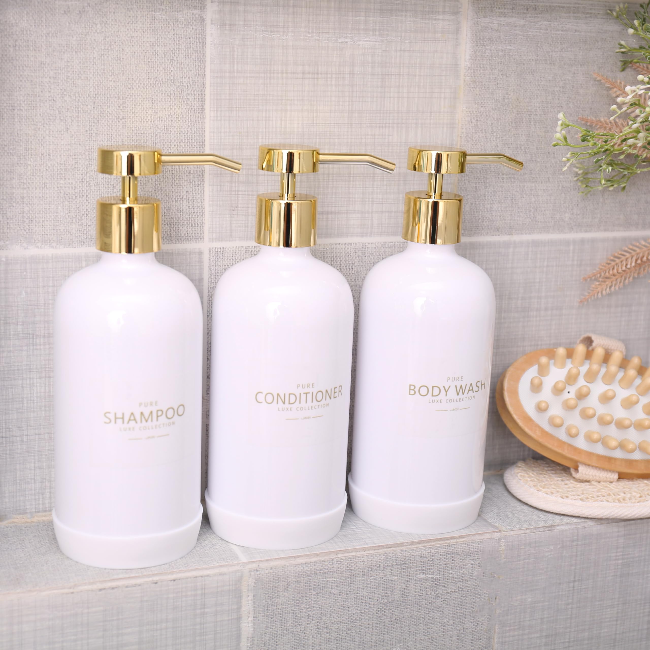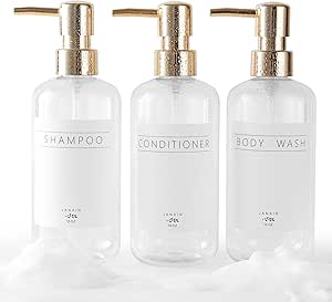 Schluss mit dem Chaos in der Dusche! Dieses elegante Shampoo-Spender Set von Janxin bringt sofort Ordnung und Stil in dein Badezimmer. Drei weiße Flaschen aus BPA-freiem Kunststoff mit goldfarbenen Pumpen - das sieht einfach klasse aus und gibt dem Bad einen richtigen Luxus-Touch. Jede Flasche fasst 600ml, also hast du lange was davon. Die wasserfesten Etiketten sorgen dafür, dass die Beschriftung auch in der feuchten Duschumgebung gut lesbar bleibt. Unter jeder Flasche ist ein rutschfestes Silikon-Pad, damit nichts umkippt. Perfekt für Shampoo, Duschgel und Conditioner - oder was auch immer du in der Dusche benutzt. Ob für die eigene Wohnung, Airbnb, Gäste-WC oder Büro - dieses Set macht überall eine gute Figur. Ein super Geschenk für alle, die Wert auf Ordnung und schönes Design legen!