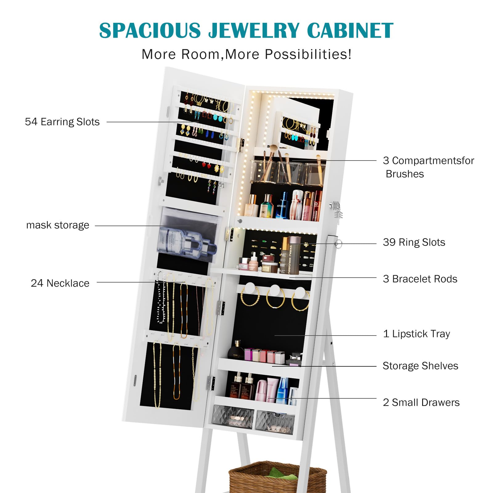 Endlich Ordnung im Schmuckchaos! Dieser tolle Schmuckschrank hat alles: großen Ganzkörperspiegel, drehbare Einrichtung und praktische Ablagen. Maße: 160x38x38 cm - passt in jedes Zimmer! Aus stabilem MDF in schickem Weiß. Haken für Ketten, Fächer für Ringe, Löcher für Ohrringe und Schubladen für alles andere. 360° drehbar - du erreichst alles bequem von einer Position. Abschließbar für deine wertvollen Stücke. Perfekt für Schlafzimmer, Ankleide oder Flur. Sieht nicht nur gut aus, sondern ist super praktisch! Mach deine Schmuckauswahl zum täglichen Vergnügen. Einfach aufstellen und sofort nutzen - dein persönlicher Juwelier-Laden zu Hause!
