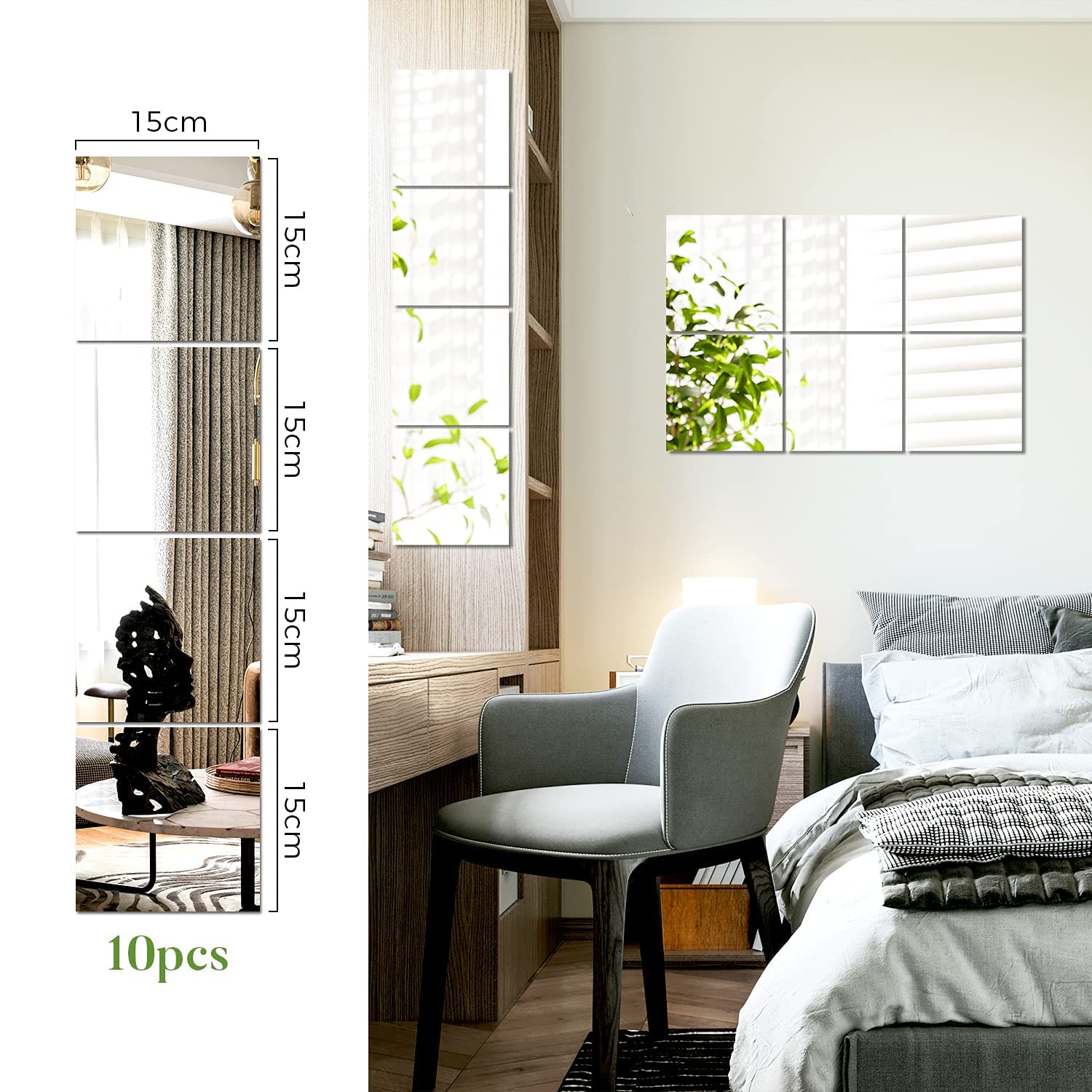Die Montage ist total einfach: Wand säubern, Schutzfolie abziehen und die Spiegel fest andrücken. Der starke Kleber hält zuverlässig auf Fliesen, Glas, Latexfarbe oder Holz. Die rahmenlosen Kanten lassen sich nahtlos zu einem großen Spiegel kombinieren. Ideal fürs Bad, Schlafzimmer, Wohnzimmer oder als stylischer TV-Hintergrund. Hol dir mehr Licht und Raumgefühl - ohne Bohren und ohne Stress!