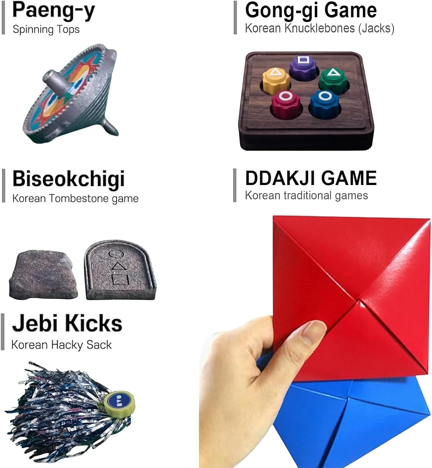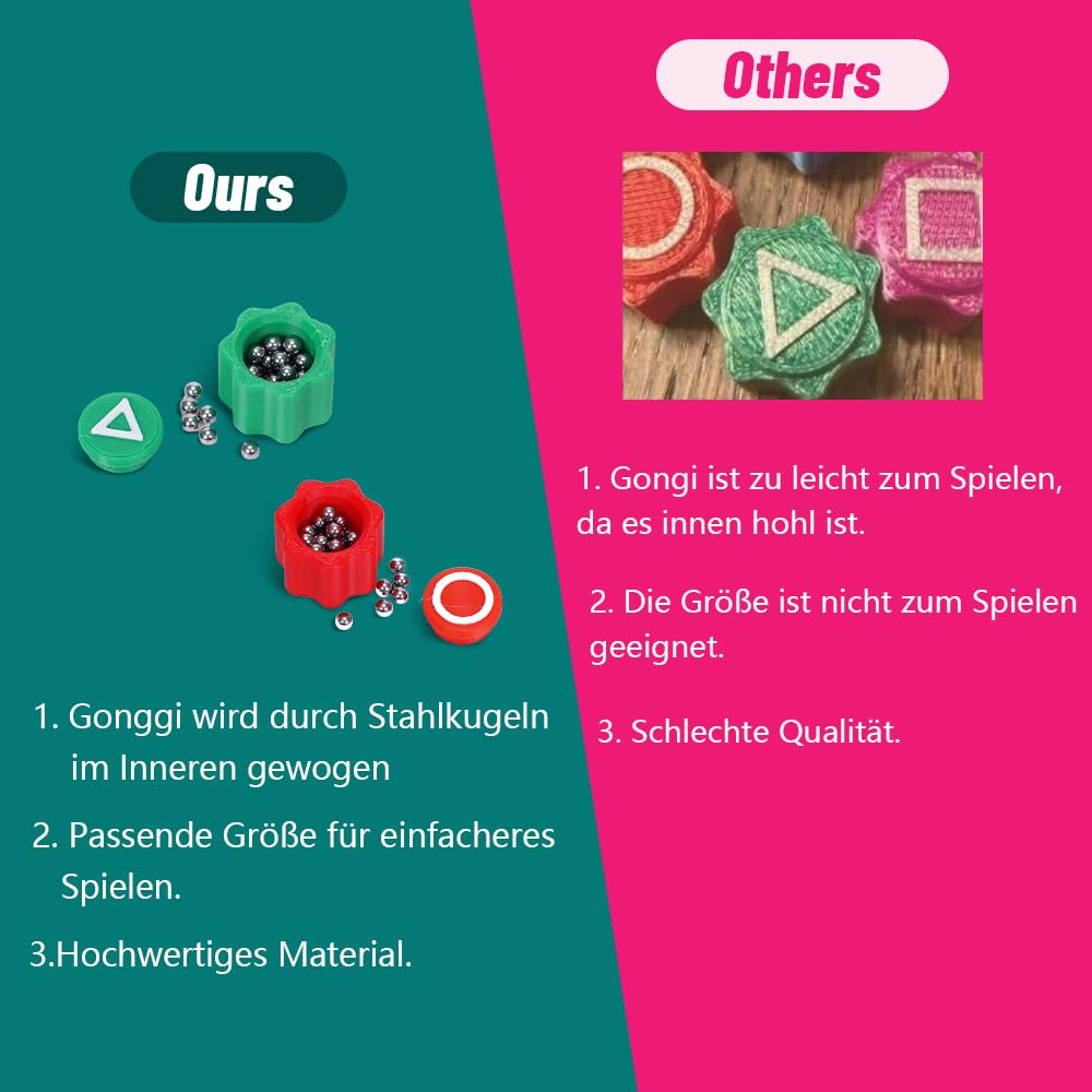 Tauch ein in die Welt von Squid Game mit diesem authentischen Gonggi Spiel! Diese 5 bunten Steine aus robustem PVC bringen dir das traditionelle koreanische Spiel näher. Einfach die Steine werfen, einen hochwerfen und schnell die anderen aufsammeln - je mehr Level du schaffst, desto schwieriger wird es! Die leuchtenden Farben machen besonders Kindern Spaß und die kleinen Steine passen in jede Tasche. Perfekt für unterwegs, Familienabende oder als Geschenk zu besonderen Anlässen. Lerne spielerisch koreanische Kultur kennen und verbessere deine Hand-Augen-Koordination. Einfache Regeln, großer Spielspaß für Groß und Klein!