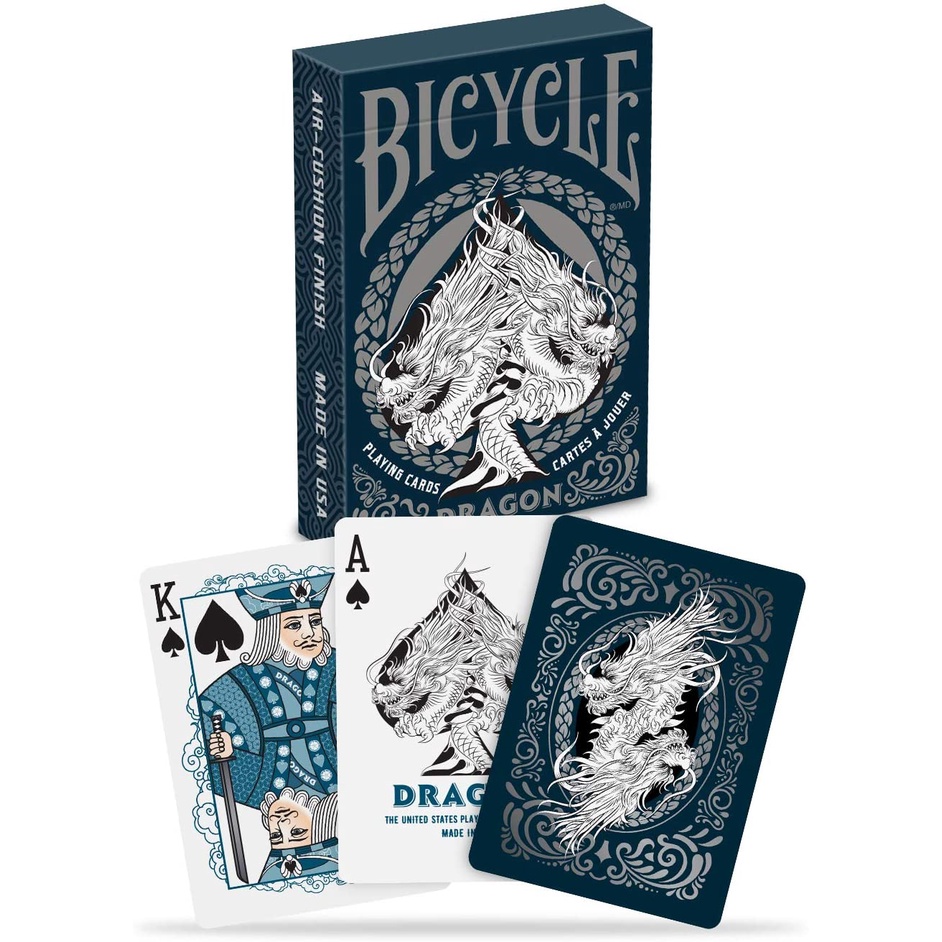 Tauche ein in die mystische Welt der Drachen mit diesen einzigartigen Bicycle-Spielkarten! Das blaue Drachen-Design auf der Rückseite ist ein echter Hingucker, und die Farbgebung der Hofkarten in Grün, Gold und Rot verleiht ihnen einen antiken Charme. Gedruckt auf hochwertigem Bicycle-Kartenstock mit Air-Cushion-Finish für perfektes Gleiten. Enthält 54 Karten: 52 Spielkarten, einen bunten und einen klassischen Joker, eine doppelseitige Karte und eine Werbekarte. Das One-Way-Design ist besonders praktisch für Zauberkünstler. Ein Muss für Kartensammler und -spieler!
