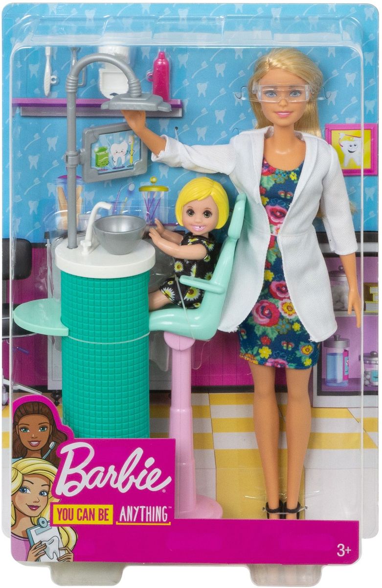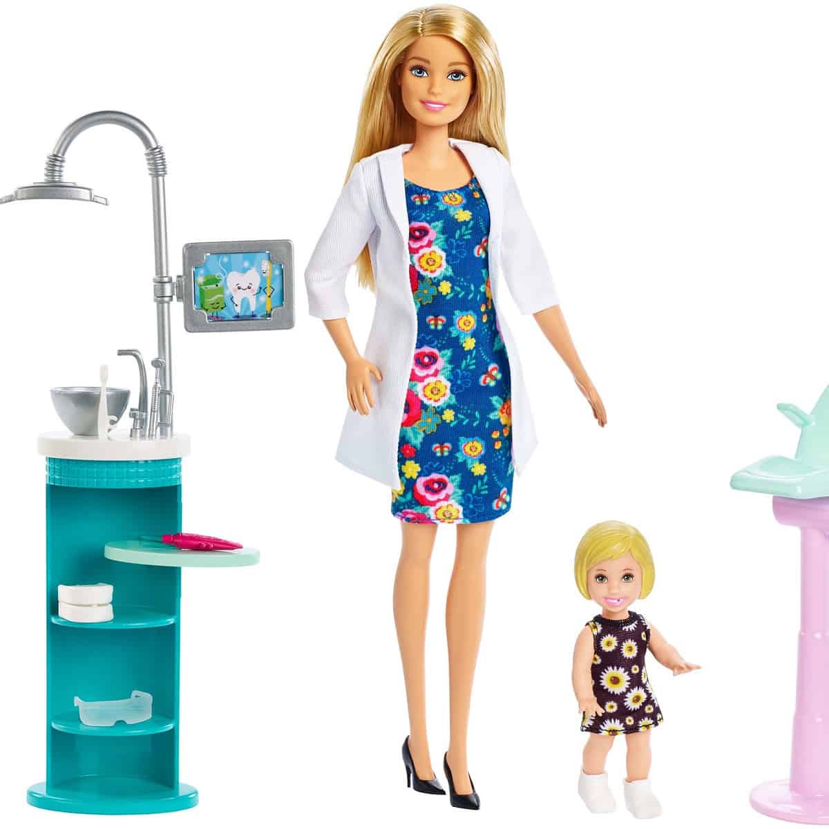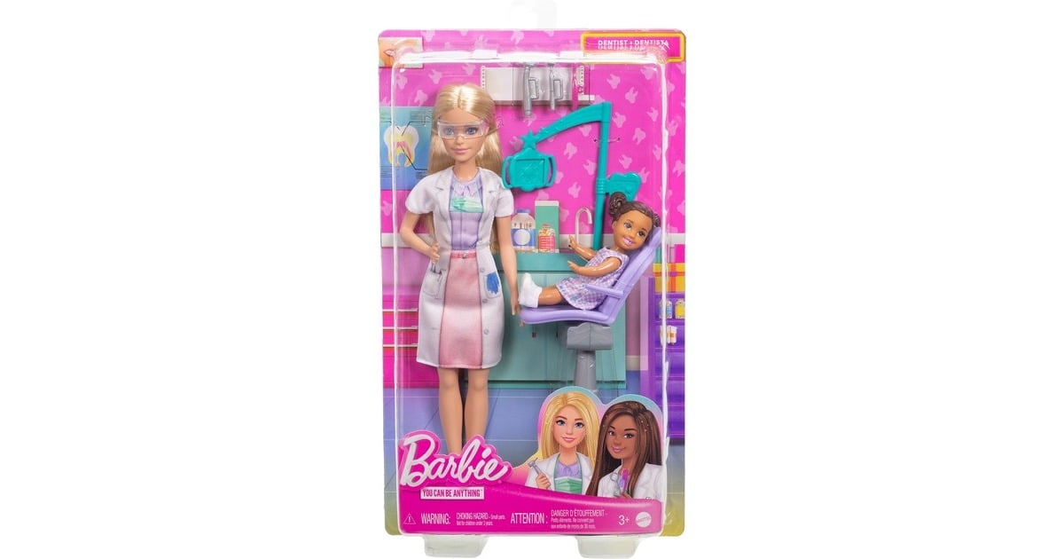 Oh, wie süß ist denn dieses Barbie Zahnärztin-Set! Da können sich Kinder stundenlang beschäftigen. Barbie ist als Zahnärztin mit weißem Kittel und blauem Kleid angezogen - total professionell! Die kleine Patientin hat sogar eine Zahnlücke und ein niedliches Gänseblümchenkleid an. Mit dabei: Ein Behandlungsstuhl, Spülbecken mit cooler Lampe und jede Menge Zubehör wie Zahnbürste, Schutzbrille und Gebissabdruck. Sogar ein Röntgenbild ist dabei - wie in einer echten Praxis! Kinder lernen spielerisch, dass Zahnarztbesuche nichts Schlimmes sind. Perfekt für Mädchen und Jungs von 3-7 Jahren. Damit können sie sich in die Rolle der Ärztin oder Patientin hineinversetzen. Die Teile passen perfekt in die Hände der Puppen. Noch mehr Spielspaß mit anderen Barbie Karriere-Puppen! Ein tolles Geschenk für Geburtstage oder Weihnachten. Wenn Kinder mit Barbie spielen, können sie alles werden, was sie sich vorstellen!