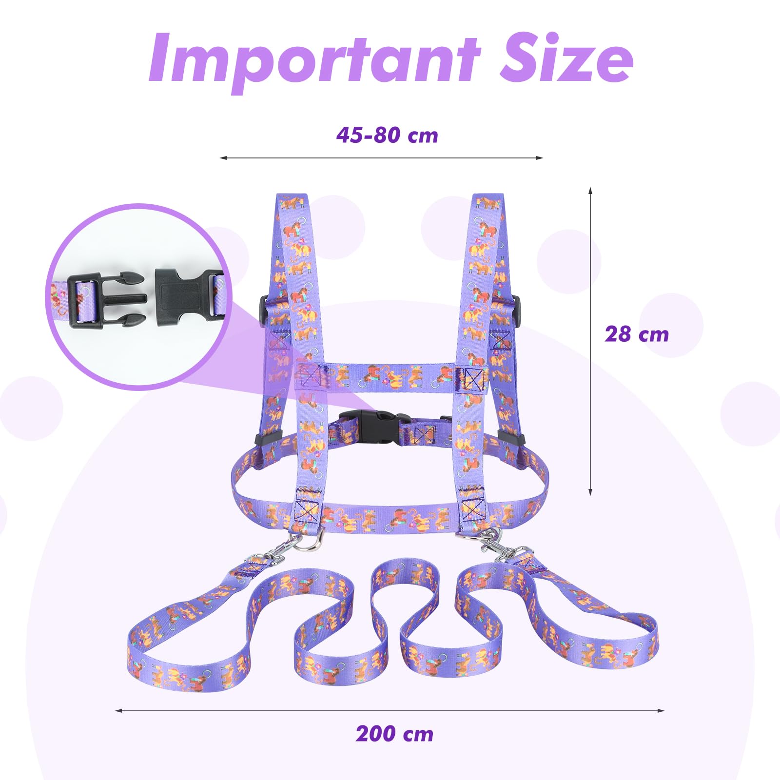 Verstellbar von 45-80cm Brustumfang - passt für Kinder von 3-12 Jahren. Aus robustem Nylon mit rutschfesten Gurten. Die 2m lange Leine gibt genug Bewegungsfreiheit!