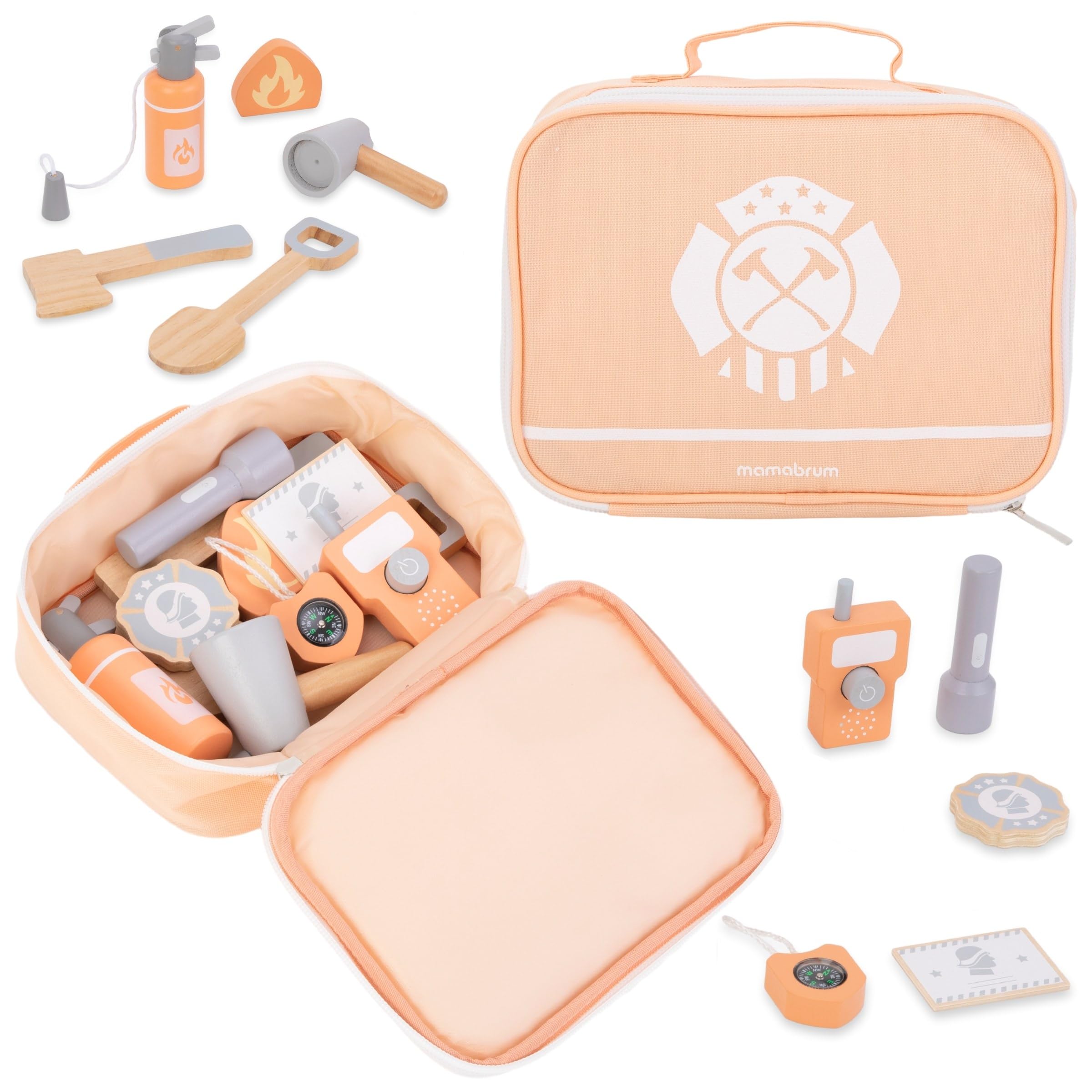 Das komplette Feuerwehr-Erlebnis für kleine Retter! Dieser coole Rucksack enthält alles was ein echter Feuerwehrmann braucht: Holz-Feuerlöscher mit beweglichem Knopf, Feuerwehr-Abzeichen, Ausweis, echten Kompass, Funkgerät, Taschenlampe, Axt, Schaufel und Megaphon. Alles aus hochwertigem Holz und Textil, sicher verarbeitet ohne scharfe Kanten. Fördert Kreativität und Rollenspiel. Perfekt für Kinder ab 3 Jahren. Mach dein Kind zum Helden des Tages!