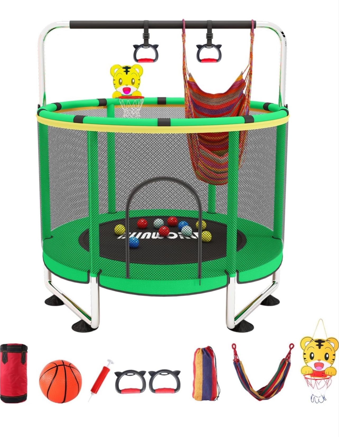 Boah, das ist mehr als nur ein Trampolin! Der Fukursul Spielspaß für drinnen und draußen bringt Action pur. Mit verstellbarer Turnstange (59-62 Zoll), Basketballkorb und coolem Zubehör. Das Sicherheitsnetz ist dreifach gepolstert - da kann nichts passieren! Hält bis zu 200 kg aus, also auch wenn mal mehrere Kinder gleichzeitig springen. Die U-förmigen Füße mit Saugnäpfen sorgen für bombenfeste Standsicherheit. Montage? Kein Problem, geht ratzfatz zusammen. Perfekt für Garten, Wohnzimmer oder Terrasse. Maße: 150x150x160 cm. Macht deine Kids glücklich und sorgt für Bewegung an der frischen Luft. Ideal für Geburtstage oder als Geschenk. Die Kleinen können sich austoben während du entspannt zuschaust. Und wenn's mal regnet? Einfach reinholen - Spaß garantiert!