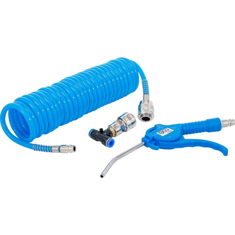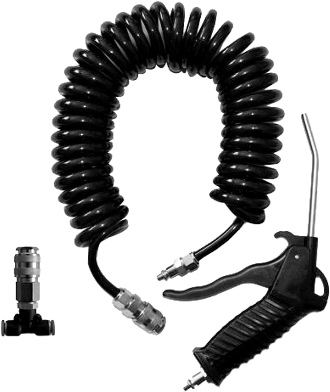 Mann, diese Druckluftpistole ist ein Alleskönner für jede Werkstatt! Mit der 100mm langen gekröpften Düse kommst du auch in die hintersten Ecken und bläst Staub, Späne und Dreck einfach weg. Der 5 Meter lange Spiralschlauch gibt dir jede Menge Bewegungsfreiheit, sodass du nicht ständig deinen Kompressor bewegen musst. Die 1/4\ Euro-Schnellkupplungsanschlüsse an Pistole und Schlauch machen den Anschluss zum Kinderspiel - einfach draufklicken und los geht's! Das Set hält einem maximalen Arbeitsdruck von 12,75 bar stand, also mehr als genug für die meisten Arbeiten. Das inkludierte T-Stück mit einem 1/4\ Anschluss für den Schlauch und zwei 6mm-Anschlüssen ist besonders praktisch für LKWs oder wenn du mehrere Geräte gleichzeitig betreiben willst. Ob zum Reinigen von Maschinen, Computern, Werkzeugen oder einfach nur zum Trockenpusten von Teilen - diese Luftpistole ist dein bester Freund in der Werkstatt. Einfach unverzichtbar!