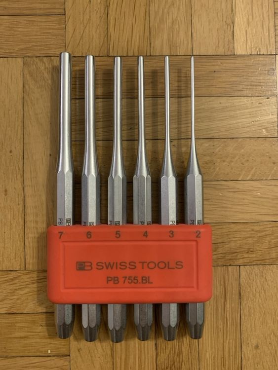 Alter, das ist Profi-Werkzeug vom Feinsten! PB Swiss Tools sind ja eh ne Klasse für sich, und dieses 6-teilige Splintentreiber-Set ist einfach nur genial. Aus extra-hartem Chrom-Vanadium-Stahl mit ner Oberhärte von ca. 59 HRC - da splittert nix ab, auch wenn du richtig draufhämmerst. Die Sechskant-Schäfte verhindern das Wegrutschen und die Spitzen sind etwa 0,05-0,5 mm unter dem Nennmaß, damit sie nicht in den Bohrungen stecken bleiben. Komplett verchromt, sieht nicht nur gut aus, sondern rostet auch nicht. Liegt super in der Hand und kommt im praktischen Kunststoffhalter - alles schön ordentlich und griffbereit. Egal ob du an Motorrädern, Fahrrädern oder Maschinen schraubst - mit diesen Treibern machst du nix falsch. Einmal probieren und du willst nie wieder was anderes!