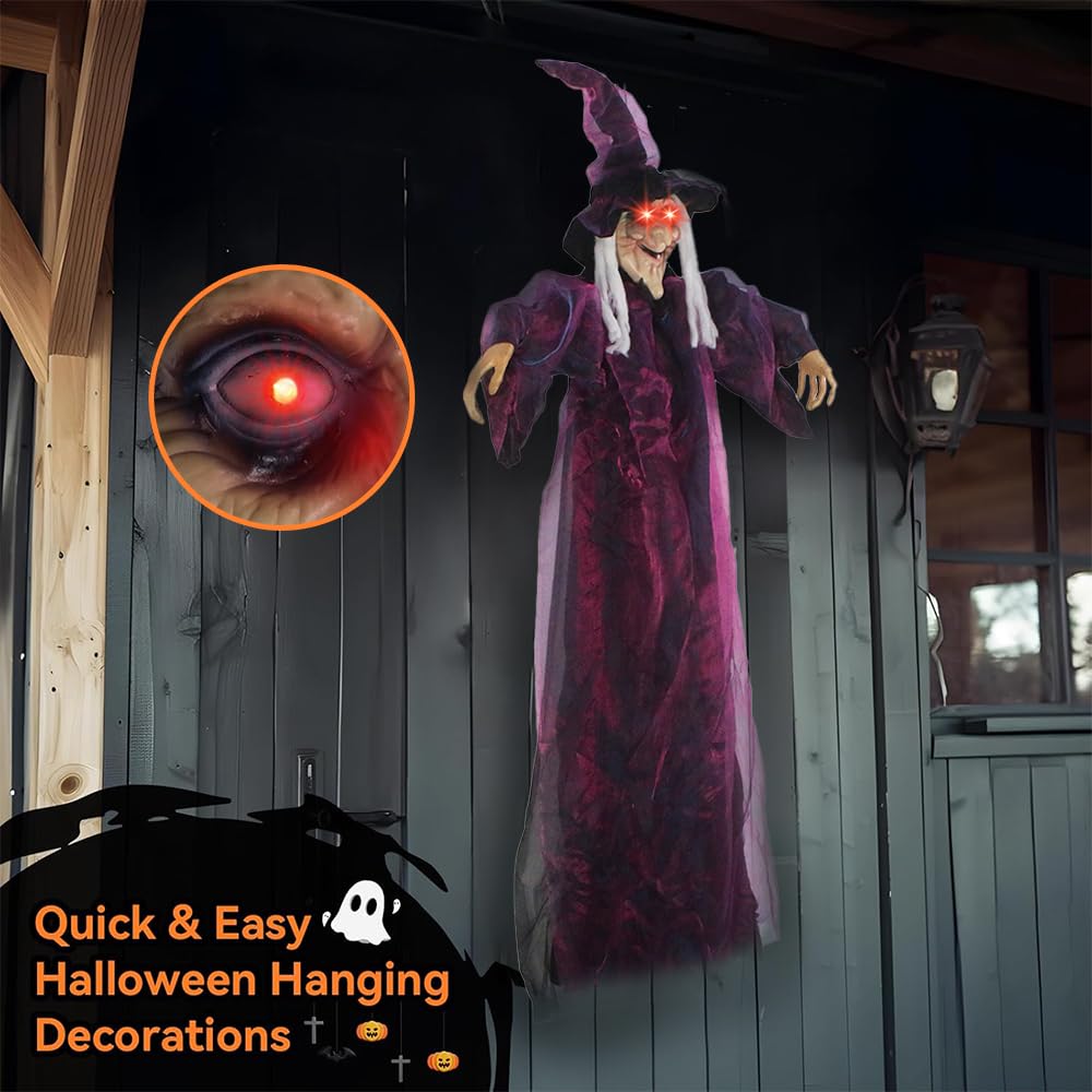 Diese Hexe macht deinen Garten zur Gruselzone! Sie reagiert auf Bewegung und Geräusche mit unheimlichen Schreien - total spontan und überraschend. Die Augen leuchten rot und rotieren sogar 360 Grad! Die Arme sind voll beweglich, du kannst sie fliegend aufhängen oder als Wächterin positionieren. Mit nur 1,8 kg superleicht und wetterfest. Einfach an Bäumen, Zäunen oder Wänden befestigen - inklusive Transporttasche für Partys. Aus umweltfreundlichen Materialien, hält auch stärkerem Wind stand. Perfekt für Halloween-Partys, Grusel-Events oder einfach um die Nachbarn zu erschrecken!