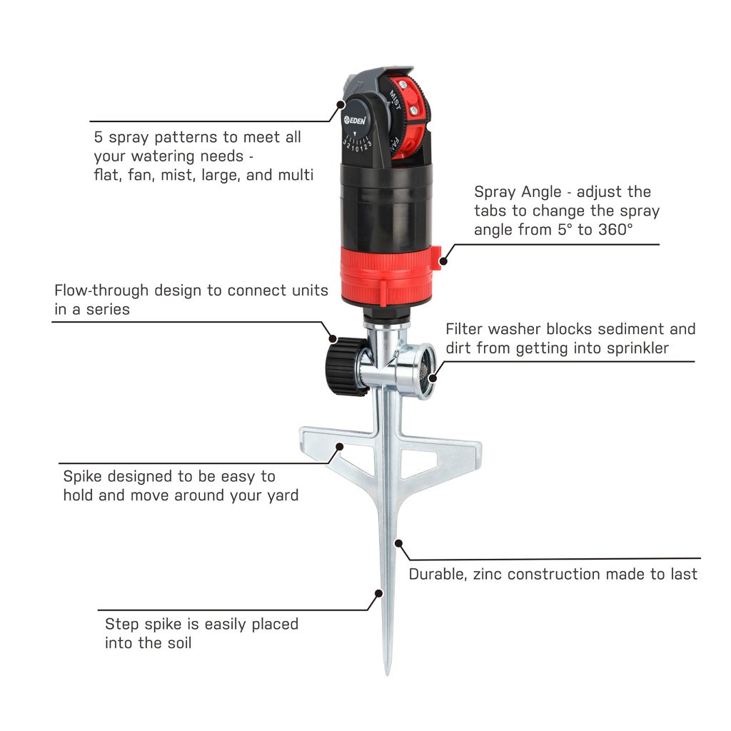 Professionelle Gartenbewässerung war noch nie so einfach! Der Eden Multi-Pattern Sprinkler bietet 5 verschiedene Sprühmuster: flach, Fächer, Nebel, groß und mehrfarbig - für jeden Bereich deines Gartens die richtige Einstellung! Bis zu 3737 m² Fläche kannst du damit bewässern - das ist richtig viel! Der Turbo-Getriebeantrieb arbeitet super leise - du kannst auch früh morgens gießen ohne die Nachbarn zu stören. Mit verstellbaren Laschen von 5° bis 360° genau einstellbar. Der 1/2 Zoll Metall-Spieß geht auch in harten Boden und rostet nicht. Besonders cool: Die Nebelfunktion für erfrischende Abkühlung an heißen Tagen! Mit Quick Connect System - Werkzeuge wechseln auch bei laufendem Wasser. 2 Jahre Garantie inklusive! Ob großer Rasen, Gemüsebeet oder Blumenbeet - dieser Sprinkler meistert alles! Einfach aufstellen, Muster wählen und den Garten genießen!