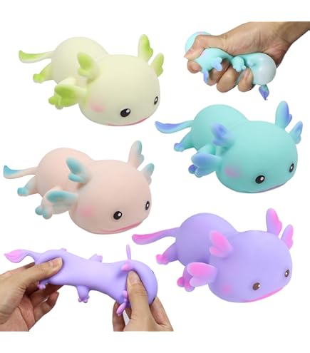 Oh wie süß! Diese Axolotl Squishys sind einfach nur niedlich. 4 Stück im Set, alle mit glitzernden Details. Aus weichem TPR-Material - super weich und knautschbar, gehen danach wieder in die ursprüngliche Form zurück. Perfekt zum Stressabbau, gegen Langeweile oder einfach nur zum Rumspielen. Klein und leicht - passt in jede Tasche für unterwegs. Ob im Büro, in der Schule oder zu Hause auf dem Sofa - diese kleinen Kerlchen machen einfach gute Laune! Tolle Geschenkidee für Kinder und Erwachsene zu Geburtstag, Weihnachten oder einfach so. Bringt Farbe und Spaß in den Alltag!