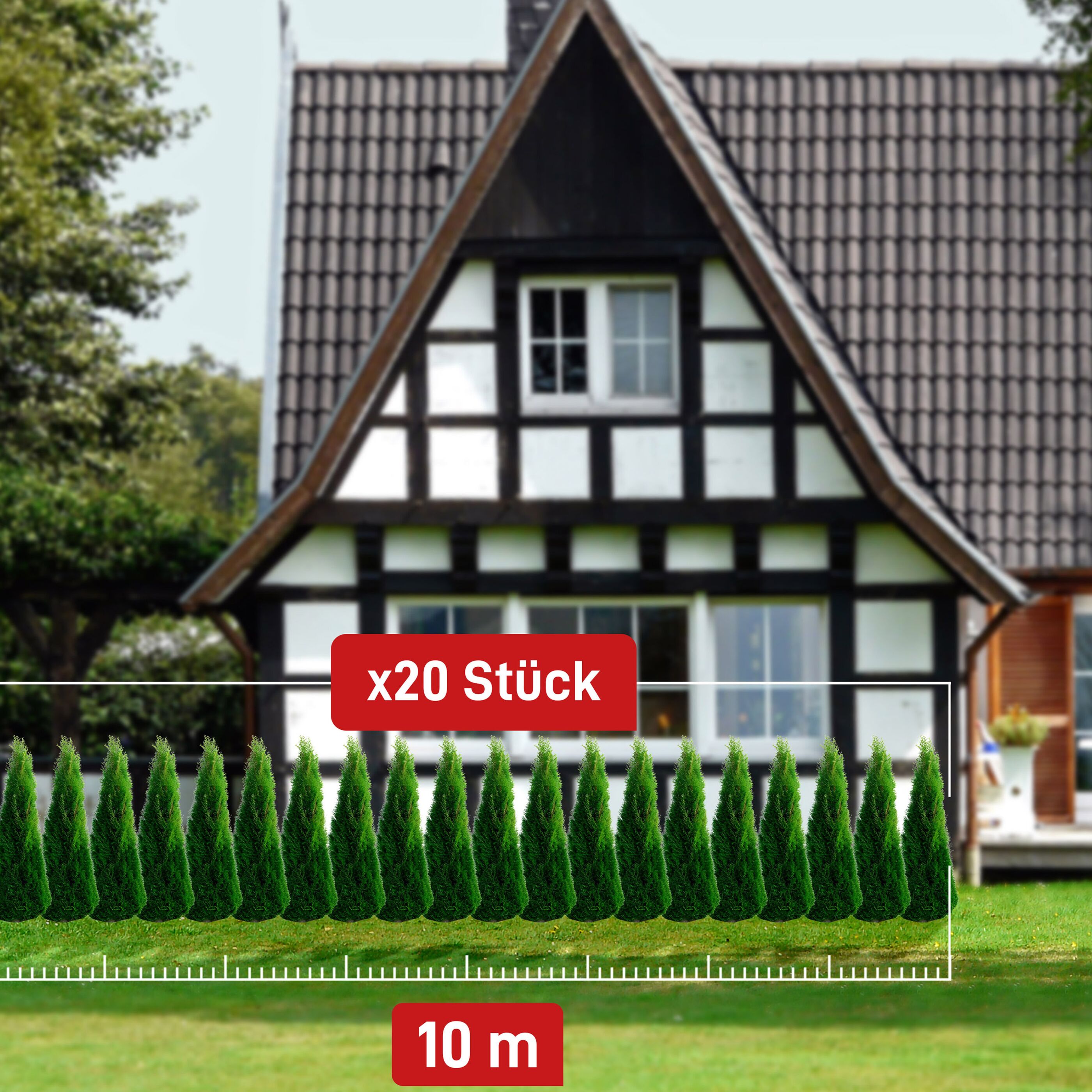 Traumhaft schöne Thuja Smaragd Heckenpflanzen für deinen perfekten Sichtschutz! Diese immergrünen Lebensbäume wachsen schlank und dicht - ideal für Grundstücksgrenzen, Vorgärten oder als natürliche Grundstückseinfassung. \\n\\nJede Pflanze ist 70-80 cm hoch (ohne Topfballen gemessen) und kommt mit festem Wurzelballen für bestes Anwachsen. Die Containerpflanzen kannst du praktisch das ganze Jahr über einsetzen, solange der Boden frostfrei ist. \\n\\nPflanzen-Details: \\n• 20x Thuja Smaragd \\n• Höhe: 70-80 cm \\n• Immergrün \\n• Winterhart bis -30°C \\n• Sofort pflanzbar \\n\\nPflanz-Tipps: \\n• Pflanzabstand: 3 pro Meter \\n• Standort: Sonne bis Halbschatten \\n• Boden: Durchlässig und humos \\n• Gießen: Nach Pflanzung gut wässern \\n\\nVorteile: \\n• Ganzjährig blickdicht \\n• Pflegeleicht und schnittverträglich \\n• Robust und langlebig \\n• Umweltfreundlich ohne Plastiktopf \\n\\nSchaff dir deine private Oase! Mit diesen Thujen hast du in wenigen Jahren eine dichte, grüne Mauer, die neugierige Blicke fernhält und deinem Garten Struktur verleiht. Einfach pflanzen, gießen und wachsen lassen!