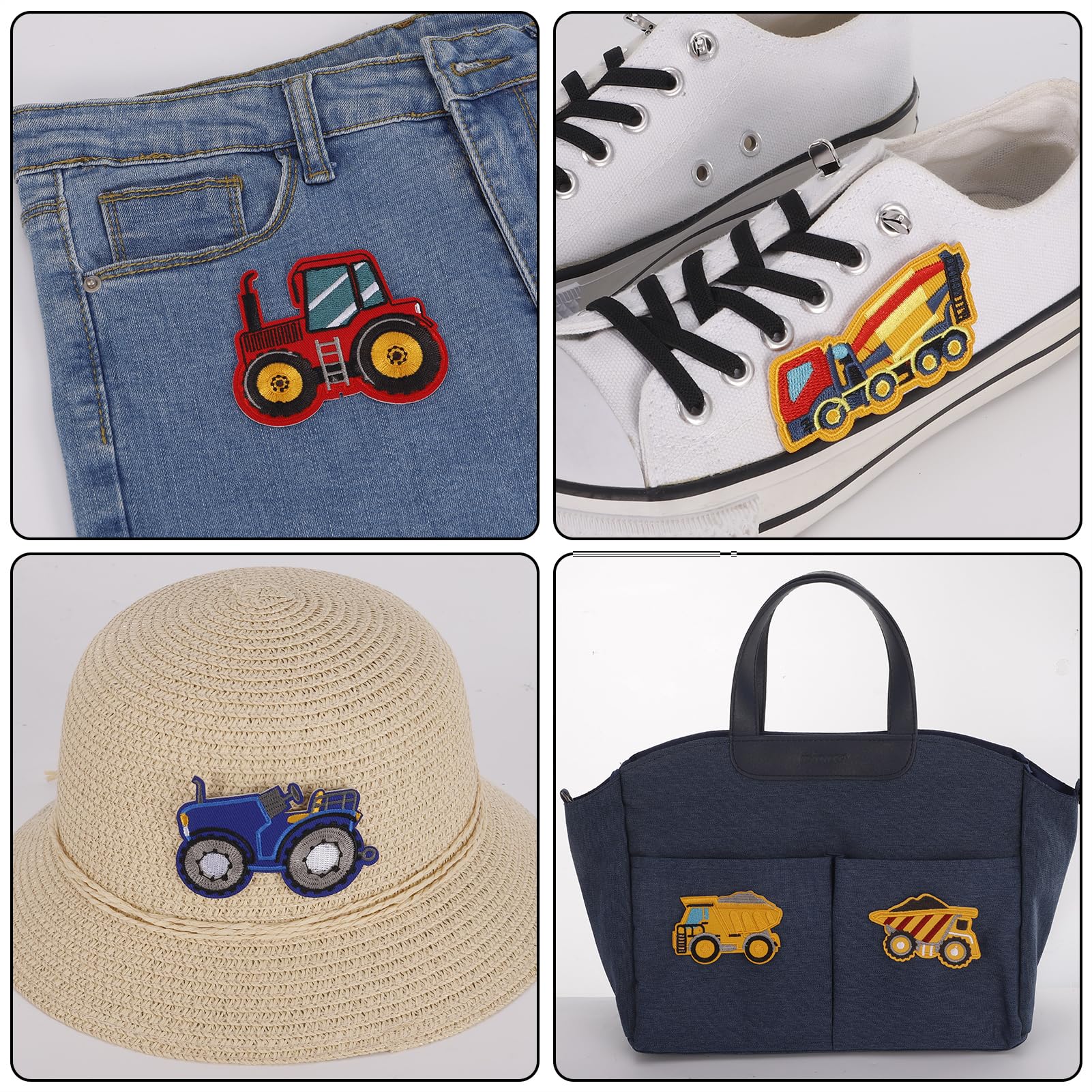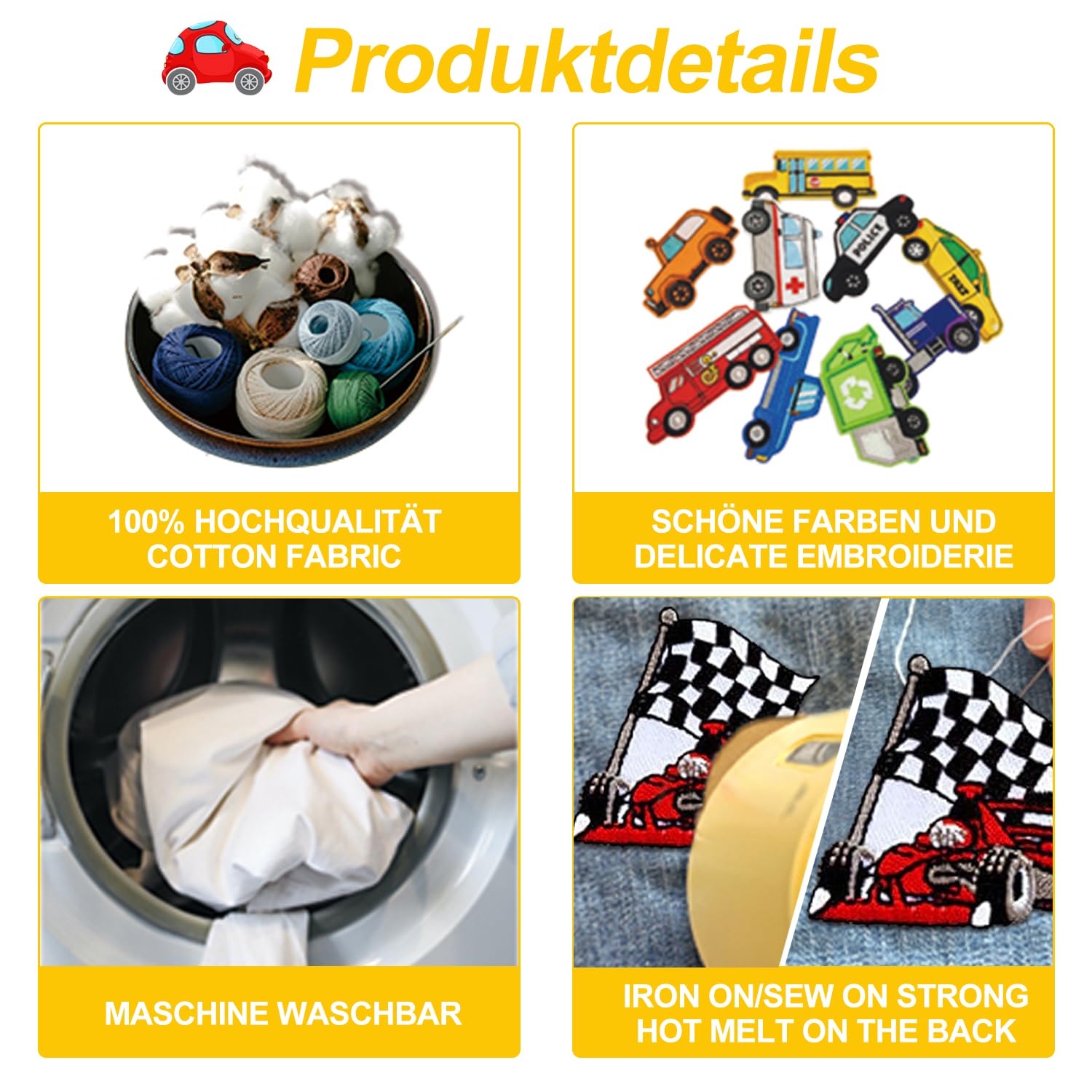 Total niedlich diese Baufahrzeug-Patches! 10 verschiedene Motiven im Set, alle aus buntem Polyester gestickt. Perfekt um Kinderkleidung aufzuwerten oder kleine Löcher zu verdecken. Einfach aufbügeln - Bügeleisen auf max. Temperatur, 35-45 Sekunden draufdrücken. Für extra Halt kannst du sie auch annähen (Nähset inklusive!). Super für Jacken, Hosen, T-Shirts, Rucksäcke - der Kreativität sind keine Grenzen gesetzt. Maschinenwaschbar bis 40°C. Achtung: Nicht für wasserdichte oder harte Materialien geeignet. Machen jede Kleidung zum individuellen Unikat!
