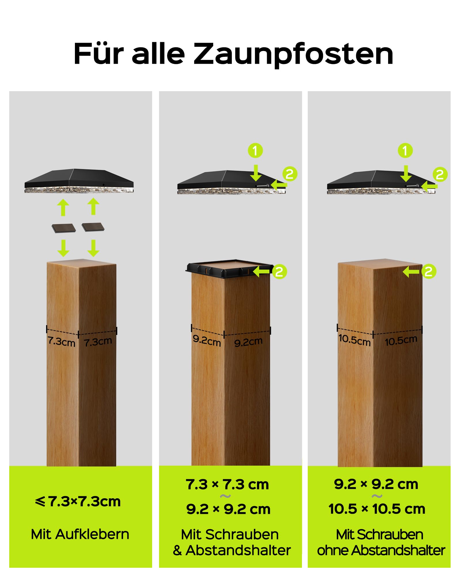 Verwandle deinen Garten in eine magische Lichtoase! Diese 10 Solar-Pfostenkappen von JACKYLED leuchten in 7 Farben und einem sanften RGB-Atemmodus. Sie passen auf Pfosten von 7x7 bis 10x10 cm und sind mit Schrauben oder Klebepads (für glatte Flächen) einfach zu montieren. IP54 wasserdicht und wetterfest, sodass sie bei Regen, Schnee oder Sonne zuverlässig leuchten. Der 800-mAh-Akku lädt sich bei Sonnenlicht in 4-6 Stunden auf und spendet bis zu 32 Stunden Licht. Wähle vor der Montage deine Lieblingsfarbe – danach ist der Schalter an der Unterseite nicht mehr zugänglich. Perfekt für Zäune, Terrassen und Wege!