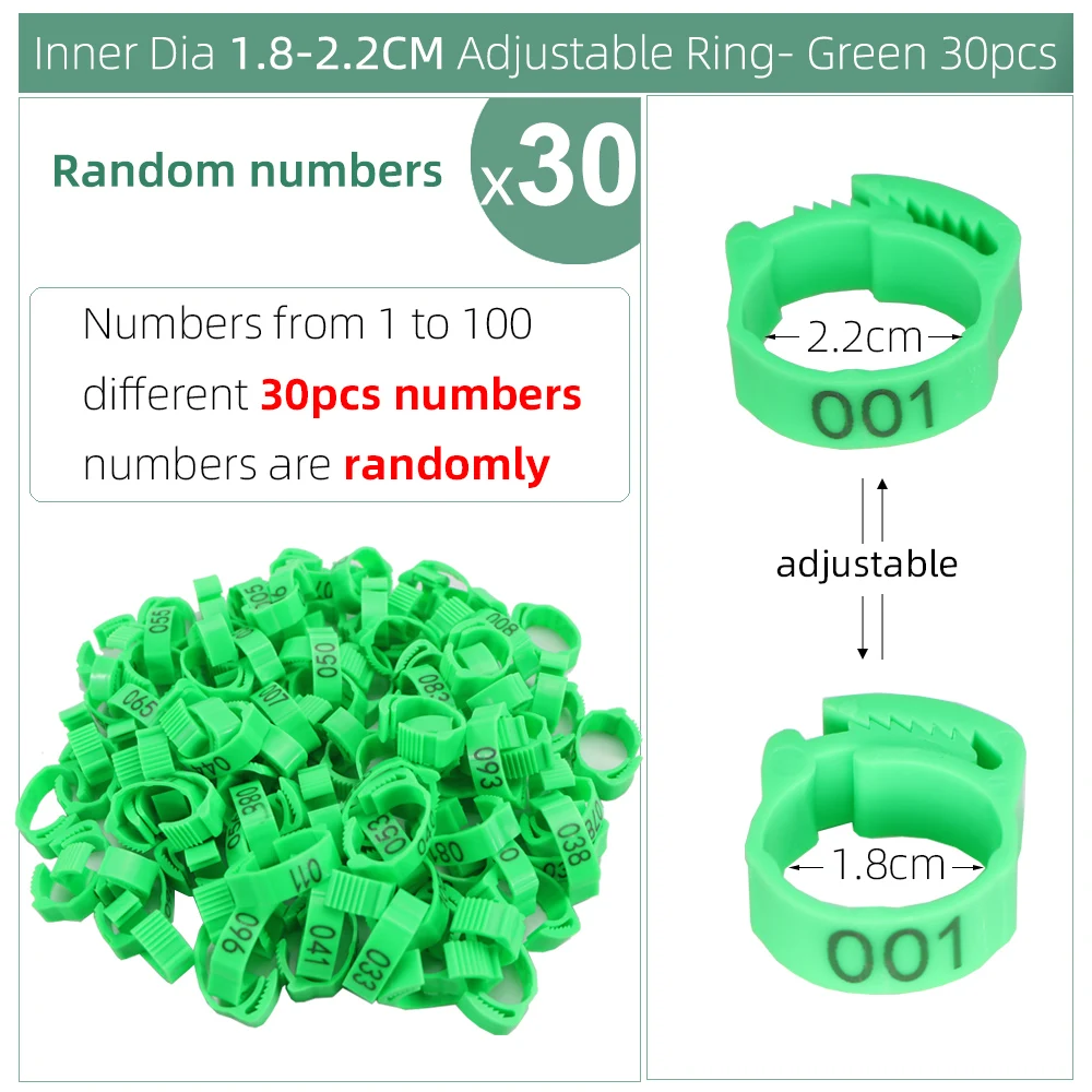 Hallo Hobby-Geflügelhalter! Mit diesen 100 farbigen Fußringen behältst du perfekt den Überblick über deine Hühner, Enten oder Gänse. Die Ringe haben einen Innendurchmesser von 14-22 mm und sind 10 mm hoch - ideal für die meisten Geflügelarten. Bitte vorher die Beingröße deiner Tiere checken!