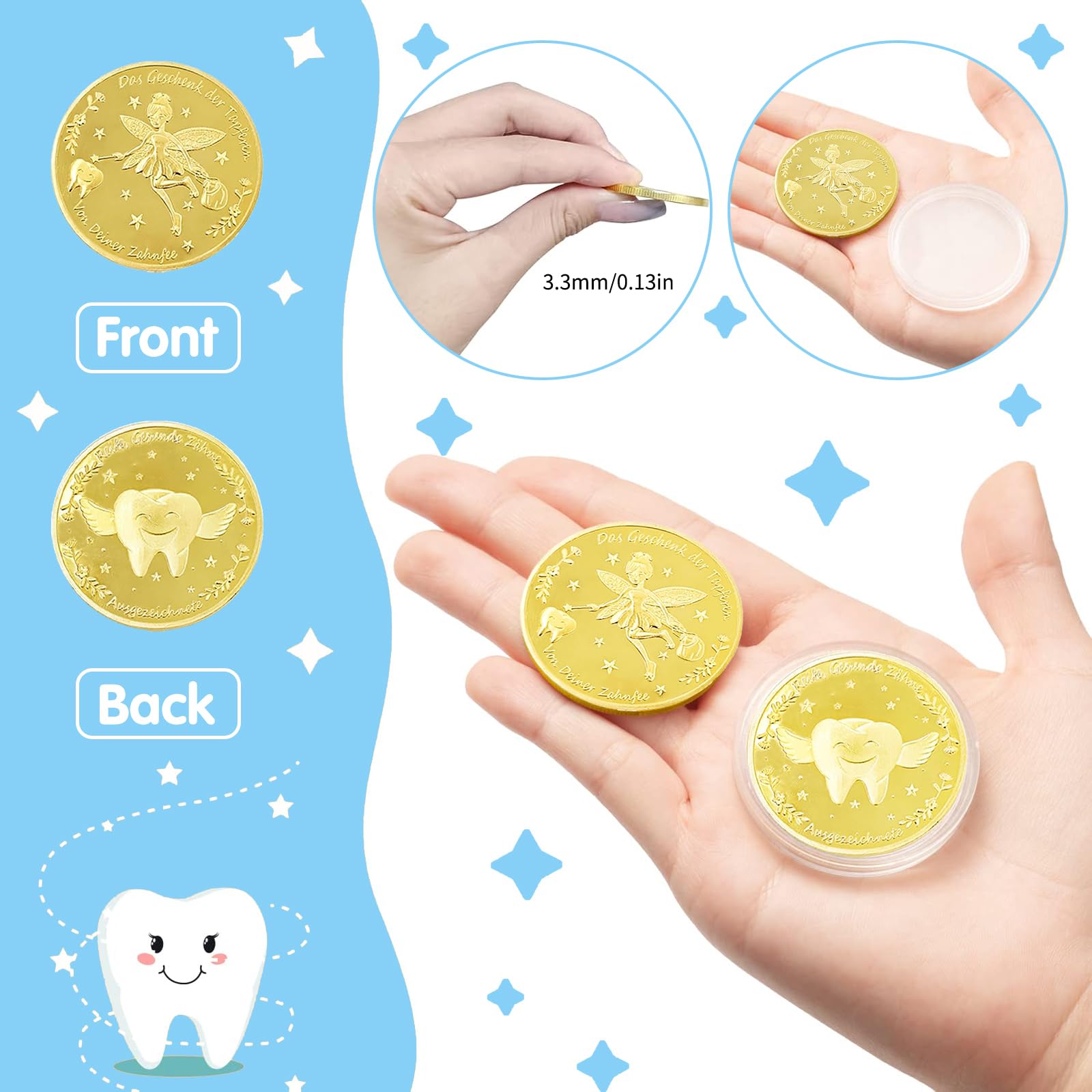 Oh wie süß! Diese Zahnfee-Münzen machen den Zahnverlust zum Erlebnis. 2 Stück im Set - eine Seite zeigt die Zahnfee, die andere ein niedliches Einhorn. Besonders für Mädchen super! Aus hochwertiger Legierung, ca. 4cm Durchmesser und 2mm dick. Jede Münze kommt in einer eigenen Schutzhülle. Nach dem alten Brauch: Zahn unterm Kissen lassen, Zahnfee tauscht gegen Goldmünze. Perfekt als Belohnung fürs Zähneputzen oder um Angst vor wackeligen Zähnen zu nehmen. Auch toll als Geburtstagsgeschenk, für Schatzspiele oder einfach als Erinnerung. Macht Kinderaugen richtig groß! Eine schöne Tradition die weiterlebt. Einfach zauberhaft!