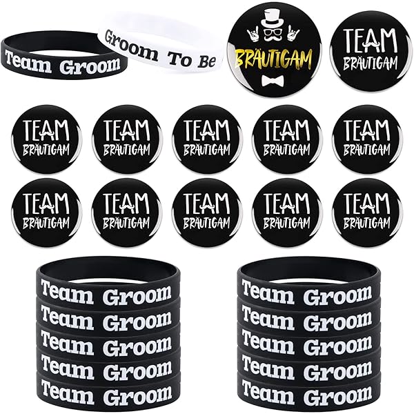 Coole Armbänder für den Junggesellenabschied! Dieses Set mit 16 Silikonarmbändern im 'Team Bräutigam'-Design macht die Feier rund. Ein Armband für den Bräutigam, 15 für seine Jungs. Aus weichem, strapazierfähigem Silikon in Weiß und Blau. Mit Aufschriften wie 'Der Bräutigam' und 'Team Bräutigam'. Perfekt als Gastgeschenk oder für ein einheitliches Gruppen-Outfit. Einfach überstreifen und die Party kann beginnen! Mach den JGA unvergesslich.