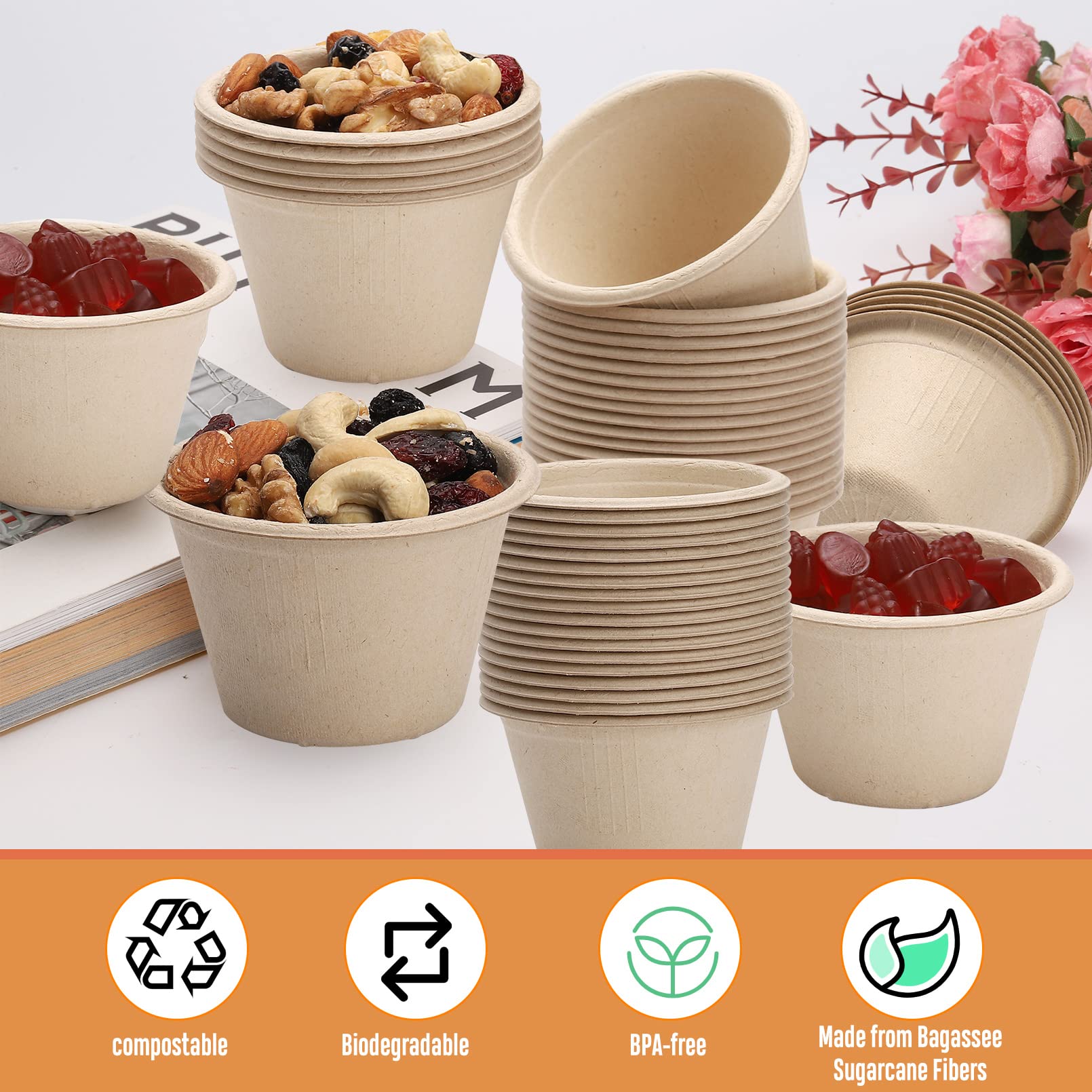 Perfekt für alle, die auf Einweg nicht verzichten wollen, aber die Umwelt schonen möchten! Diese 200 Portionsbecher aus Bagasse-Fasern sind komplett kompostierbar, BPA-frei und ohne Wachs oder Gluten. Mit 2 Unzen Fassungsvermögen (ca. 60ml) ideal für Saucen, Gewürze, Souffles, Marmeladen oder kleine Desserts. Die Maße: 6,4cm Durchmesser, 4cm Bodendurchmesser und 3,3cm Höhe. Das natürliche Braun passt zu jedem Anlass - ob Familienfeier, Hochzeit oder einfach für den täglichen Gebrauch. Die Becher sind wasser- und ölbeständig, stabiler als normale Pappbecher und brechen nicht so leicht. Du kannst sie problemlos stapeln - platzsparend in der Aufbewahrung und einfach zu transportieren. Nach Gebrauch einfach kompostieren - die Entsorgung ist damit absolut umweltfreundlich. Vielseitig einsetzbar für Eis, Salate, Snacks oder als Probierbecher. Mach deine nächste Party nachhaltig ohne auf Praktikabilität verzichten zu müssen!