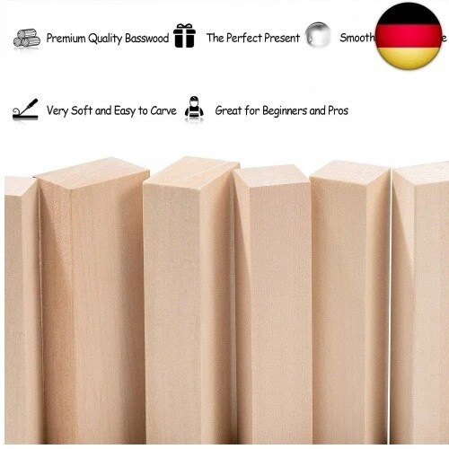 Perfekt für alle Schnitz-Fans! 20 Stück Lindenholz-Rohlinge, je 10x2,5x2,5 cm groß. Lindenholz ist mega weich und leicht zu bearbeiten - ideal für Anfänger und Profis. Oberfläche super glatt - lässt sich gut bemalen oder lackieren. Ungiftig und sicher. Komplett naturbelassen - deiner Kreativität sind keine Grenzen gesetzt. Toll für Schnitzkurse, DIY-Projekte oder als Geschenk für bastelbegeisterte Freunde. Kommt aus heimischen Wäldern - gutes Material! Packmaß: 25,5x20,5x2,5 cm. Einfach losschnitzen und coole Figuren, Schmuck oder Deko draus machen. Macht richtig Spaß!