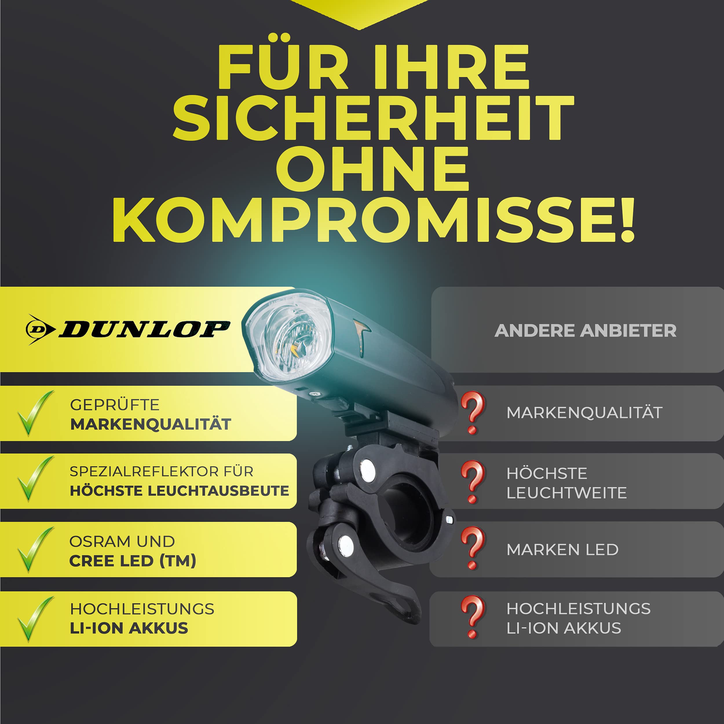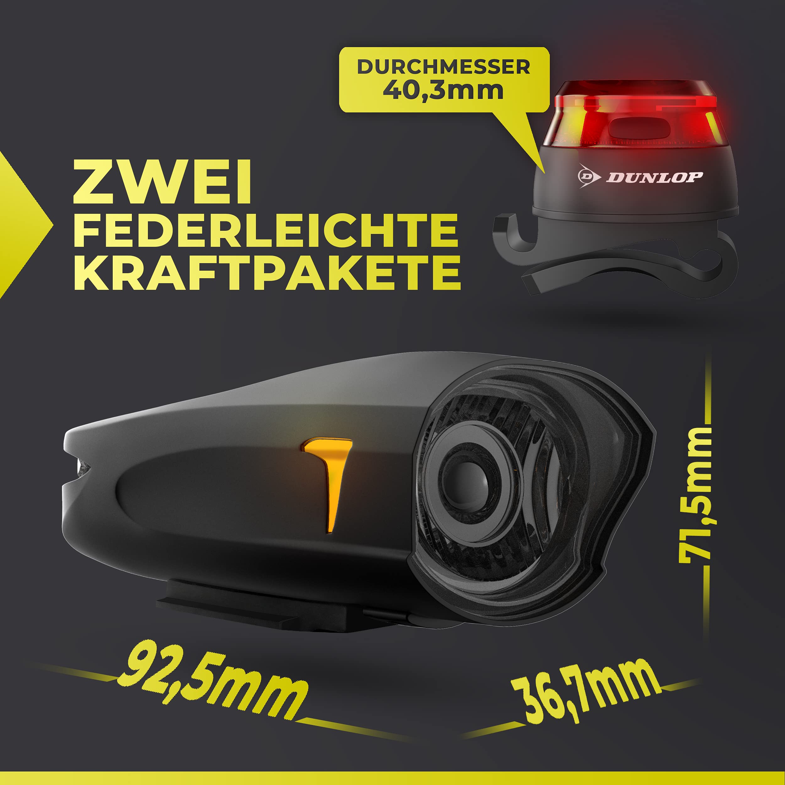 Du kannst die Lichter sogar als Taschenlampe oder Signalgeber am Rucksack verwenden. Ein richtig durchdachtes Set von der bekannten Marke DUNLOP, das wirklich hält, was es verspricht!