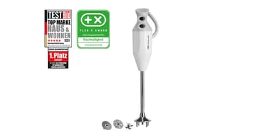 Der ESGE Zauberstab ist einfach legendär! Mit 200 Watt Power und zwei Geschwindigkeitsstufen (bis zu 17.000 U/min) püriert er alles, was dir in die Küche kommt. Das coole Design sieht nicht nur gut aus, sondern kommt auch mit praktischem Stativ zur Aufbewahrung. Im Lieferumfang sind Schlagscheibe für Sahne, Multimesser und Fleisch- und Gemüsemesser dabei. Made in Switzerland und mit 5 Jahren Garantie - einfach Qualität, die sich lohnt. Ob Suppen pürieren, Smoothies mixen oder Sahne schlagen - mit diesem Kraftpaket meisterst du jede Küchenaufgabe!