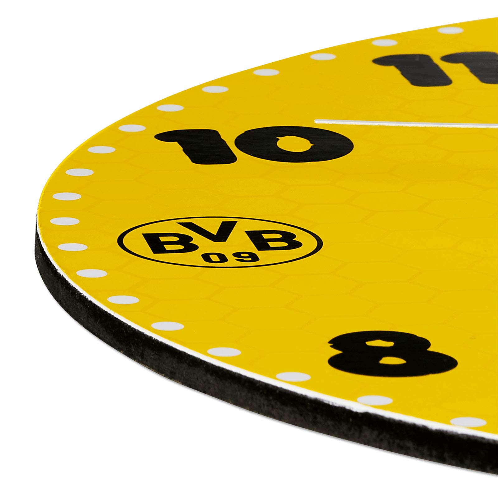 Echte BVB-Fans aufgepasst! Diese offizielle Borussia Dortmund Wanduhr bringt Stadion-Atmosphäre in dein Zuhause. Mit 30cm Durchmesser ein echter Hingucker für jedes Fan-Zimmer oder Wohnzimmer. Das Design zeigt das legendäre Signal Iduna Park Stadion in den Vereinsfarben Schwarz-Gelb. Das Ziffernblatt ist super übersichtlich und die gelben Zahlen auf schwarzem Grund sind gut lesbar. Batteriebetrieben (1x AA benötigt) - also kein lästiges Kabel. Das Quarzuhrwerk läuft super genau und leise. Aus robustem Kunststoff gefertigt - die Uhr hält was aus! Perfekt als Geschenk für BVB-Fans oder natürlich für dich selbst. Einfach aufhängen und jeden Tag an dein Lieblingsteam denken! Ob im Jugendzimmer, Büro oder Wohnbereich - diese Uhr ist überall ein Blickfang. Echt wahr - damit zeigst du, wo dein Herz schlägt!