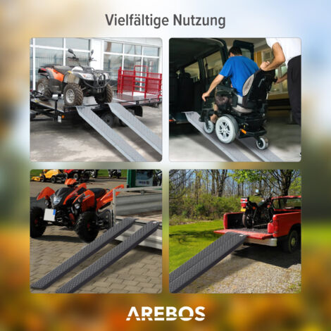 Endlich easy ein- und ausladen! Diese zwei robusten Auffahrrampen aus verzinktem Stahl halten zusammen satte 400kg aus - pro Rampe 200kg. Mit 135cm Länge und der anti-rutsch Lochung auf der Oberfläche fährst du sicher drauf, egal ob mit Motorrad, Quad, Rasenmäher oder kleinen Autos.