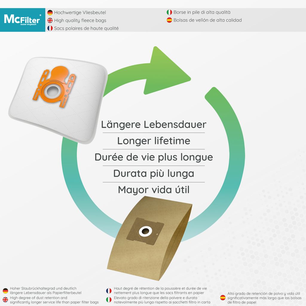 Puh, Staubsaugerbeutel wechseln muss sein - aber mit den richtigen Beuteln macht's sogar Spaß! Diese McFilter Beutel sind die perfekte Lösung für deinen Siemens VSQ5X1230 oder andere kompatible Modelle.\n\nWas diese Beutel besonders macht? Sie sind 5-lagig aus robustem Vlies - halten viel länger als normale Papierbeutel! Der Schmutz wird gleichmäßig aufgenommen, die Saugleistung bleibt top. Und dank der Seitenfalten ist richtig viel Platz drin.\n\nDie stabile Kunststoff-DeckScheibe ist mein Lieblingsfeature - die sitzt bombenfest und verhindert, dass Staub in den Sauger gelangt. Die zusätzliche Gummidichtung macht das Ganze absolut dicht.\n\nNach dem Wechsel einfach die automatische Verschlussklappe zuklappen - kein Staub wirbelt mehr auf! Super hygienisch bei der Entsorgung.\n\nIm Lieferumfang sind sogar 4 Mikrofilter dabei, die du individuell zuschneiden kannst. Perfekt abgestimmt auf dein Gerät!\n\nKompatibel mit: Siemens VSQ5X1230, VS 01E2001, VS 01E2100, Bosch Typ K, Arriva und vielen mehr. Einfach Beutel einsetzen bis es klickt - schon bist du ready für die nächste Reinigungsaktion!