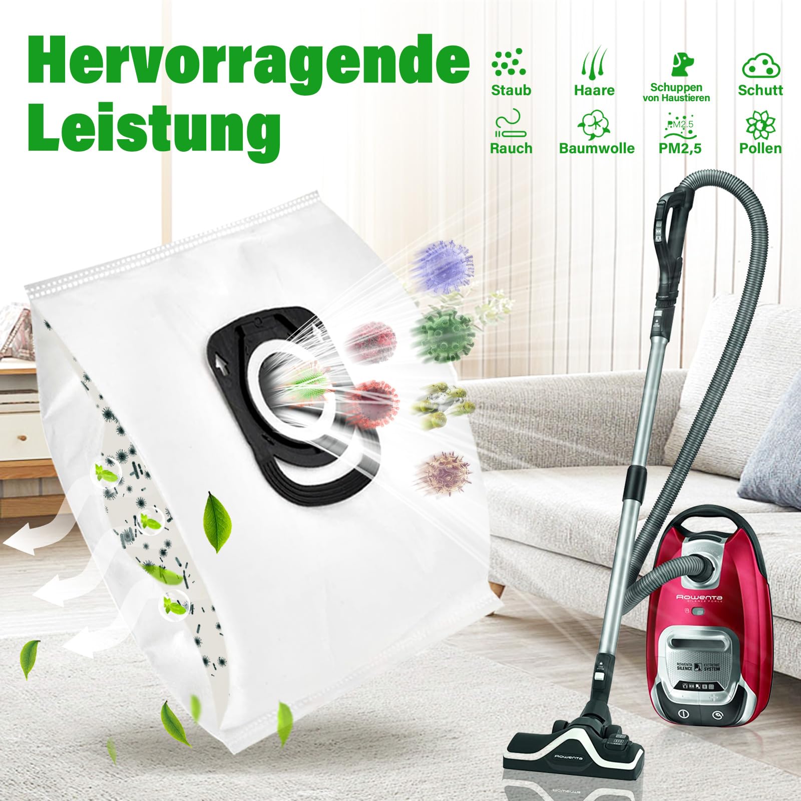 Frische Leistung für deinen Rowenta Staubsauger! Diese 8 Estelife Staubsaugerbeutel im Set passen perfekt für Silence Force Modelle RO64xx, RO63xx, RO68xx, RO39xx sowie Compact Power, Hygiene+ und X-Trem Power. Mit 5-lagiger Feinfaser-Filterschicht für optimale Filterleistung - fängt 99,97% der Staubpartikel zuverlässig ein. Besonders hygienisch: Beim Entfernen schließt sich der Beutel automatisch. Größere Kapazität sorgt für konstant starken Saugkraft, auch wenn der Beutel fast voll ist. Einfacher Wechsel durch passgenaue Ausrichtung. Dein Staubsauger wird wieder wie neu saugen! Ideal für Allergiker und Haushalte mit Haustieren.