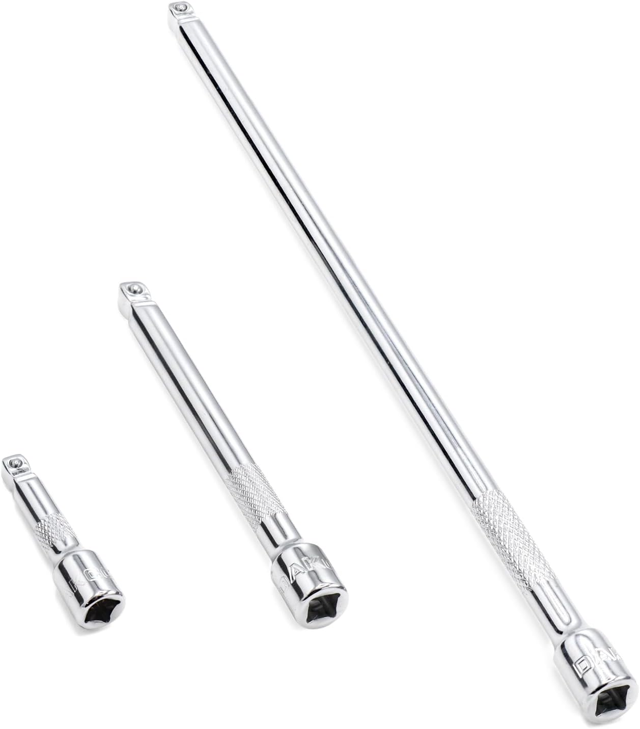 Dieses 3-teilige Verlängerungs-Set für deine Steckschlüssel ist ein echter Game-Changer in der Werkstatt! Mit den Längen 75 mm (3 Zoll), 150 mm (6 Zoll) und 250 mm (10 Zoll) bist du für jede Schraube gewappnet - egal wie versteckt sie liegt. Aus robustem Chrom-Vanadium-Stahl gefertigt, halten diese Verlängerungen auch mal was aus und rosten nicht so schnell. Der Federkugelverschluss sorgt dafür, dass die Stecknüsse sicher sitzen bleiben und nicht unterm Druck abspringen. Super praktisch! Der gerändelte Griff gibt dir auch bei festsitzenden Schrauben genug Grip. Ob du am Auto schraubst, Möbel zusammenbaust oder Maschinen wartest - mit den verschiedenen Längen kommst du wirklich überall hin. Die polierte Chromoberfläche sieht nicht nur professionell aus, sondern ist auch leicht zu reinigen. Für Heimwerker und Profis gleichermaßen geeignet. Du wirst dich wundern, wie oft du diese Verlängerungen benutzt, wenn sie erstmal in deinem Werkzeugkoffer sind. Einfach unverzichtbar für jeden, der gerne selbst Hand anlegt!