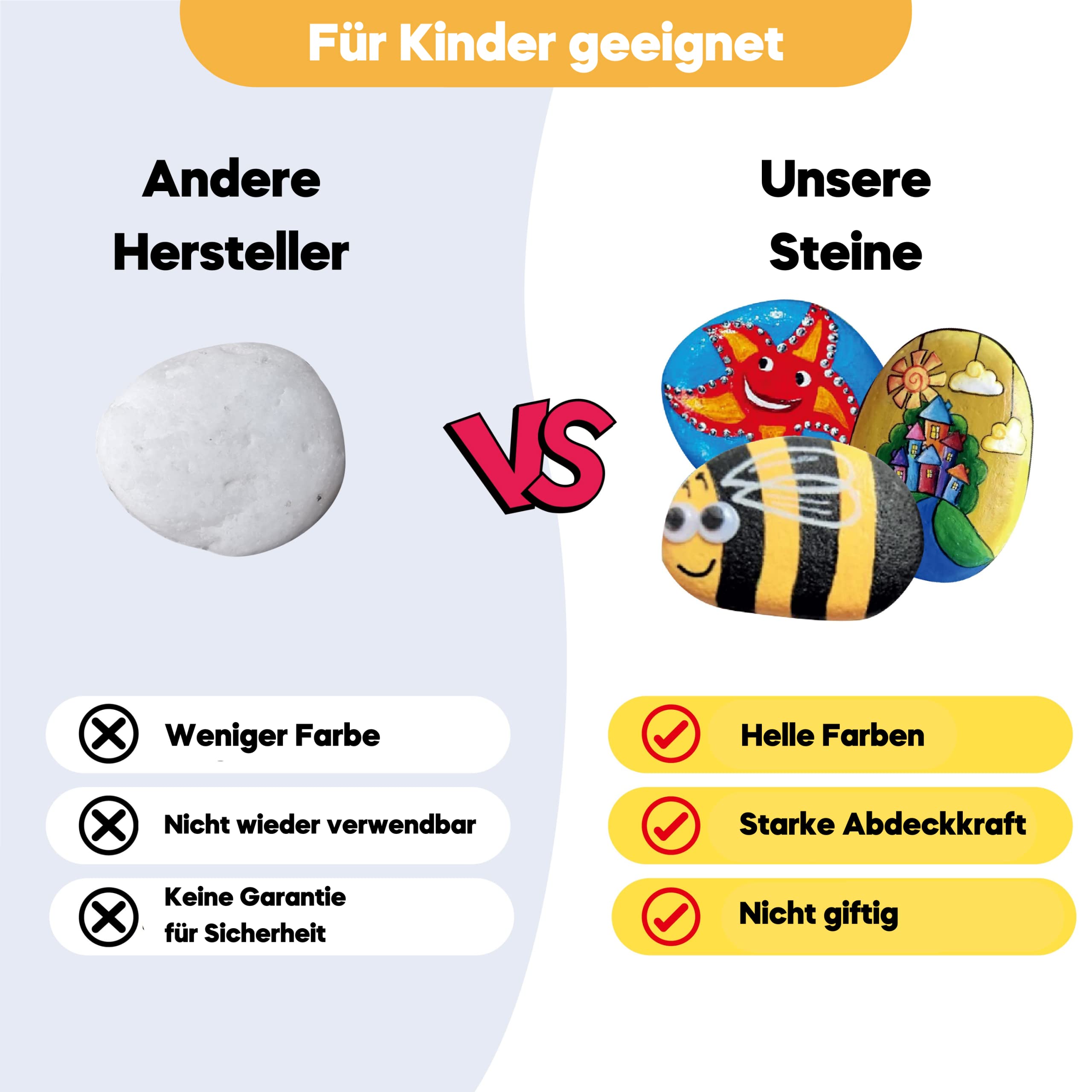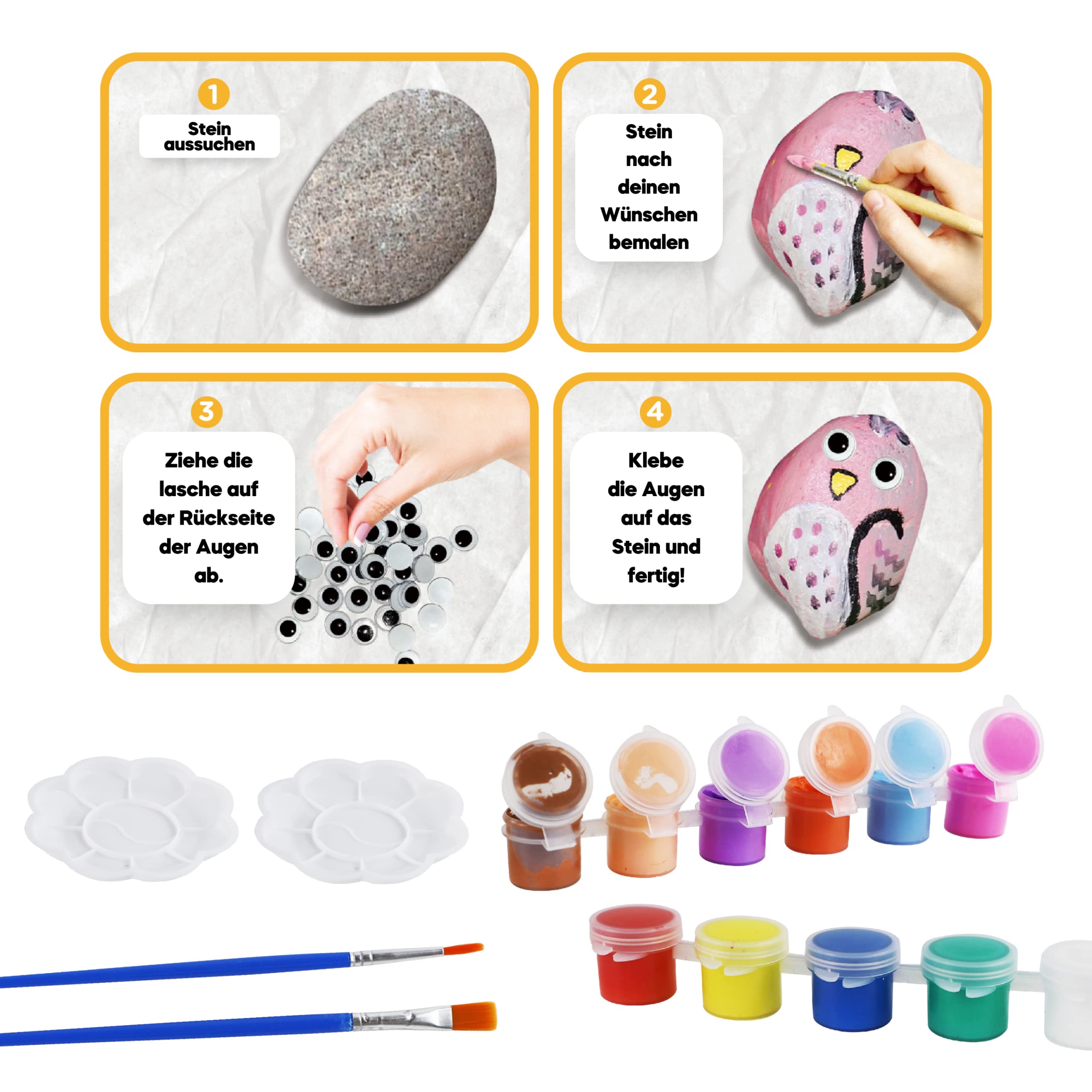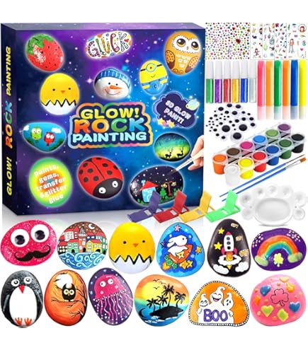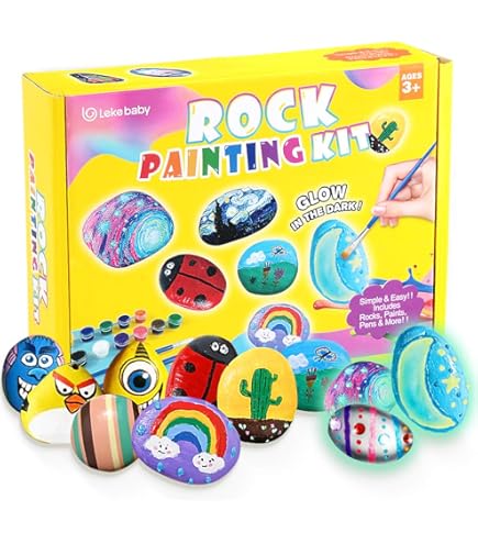 Hey, was für ne coole Bastelidee! Dieses Steine-Bemalen-Set ist perfekt für kreative Kids ab 6 Jahren. Im Set sind 12 Steine dabei - davon 2 sogar Leuchtsteine! Plus jede Menge Farben, Pinsel und süße Aufkleber. Deine Kinder können damit total niedliche Stein-Figuren gestalten. Super für Kindergeburtstage, Regentage oder einfach so. Fördert die Kreativität und die Feinmotorik. Alles in einer Box - kein zusätzliches Zubehör nötig. Macht auch Erwachsenen Spaß! Einfach Stein aussuchen, anmalen, Augen draufkleben und fertig ist das Kunstwerk. Perfektes Geschenk für Jungen und Mädchen!