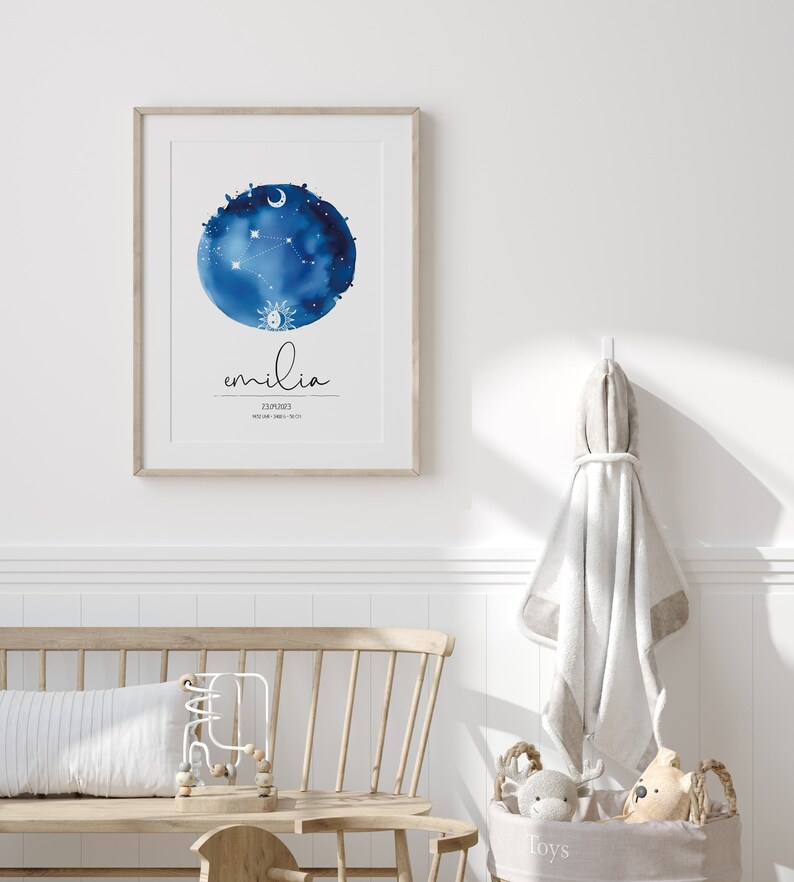 Mit funkelnden Sternen und dem persönlichen Sternbild wird das Poster zum echten Hingucker im Babyzimmer. Hochwertiger Druck auf Premium-Künstlerpapier in Deutschland - farbintensiv und langlebig.