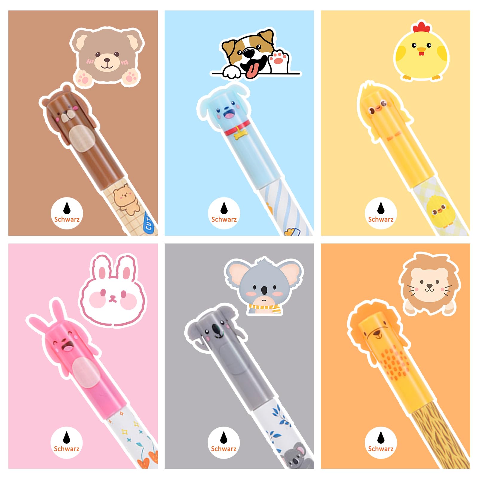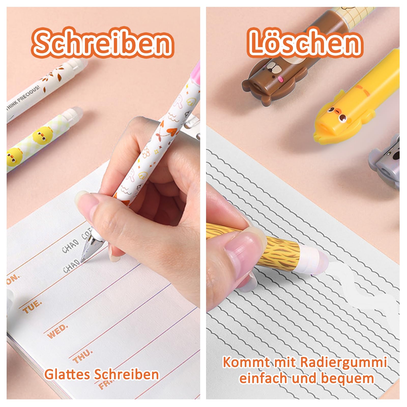 Wow, diese radierbaren Gelschreiber sind ja mal genial! Mit der speziellen Thermo-Tinte kannst du alles wegradieren - einfach mit dem integrierten Radiergummi reiben und die Reibungswärme lässt die Tinte verschwinden! Im Set bekommst du 4 Stifte mit niedlichen Tiermustern am Ende - das macht Schreiben gleich doppelt Spaß! Die 0,7 mm Mine schreibt super glatt und verschmiert nicht. Der rutschfeste Griff liegt angenehm in der Hand und ermüdet nicht, selbst bei langen Schreibsessions. Perfekt für Schüler, Studenten oder Büroarbeit - wenn du häufig korrigieren musst, bist du hier genau richtig! Aus ungiftigem, BPA-freiem Kunststoff und sicher für Kinder. Die Tierfiguren sind nicht nur niedlich, sondern auch praktisch als Radierer. Einfach in jede Federmappe packen und immer dabei haben - ob in der Schule, Uni oder im Meeting!