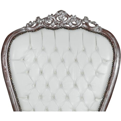 Wow, dieser Barock-Sessel ist ja der absolute Hingucker! Im edlen Louis XIV Stil mit goldenen Verzierungen und weißem Kunstleder macht er in jedem Raum was her. Ob im Wohnzimmer, Schlafzimmer oder sogar im Geschäft - der Sessel verleiht sofort diesen royalen Touch. Maße: 60x65cm, Höhe 94cm, Sitzhöhe 47cm. Aus lackiertem Holz mit wertvollen Edelstein-Details in der Sitzfläche. Super bequem und total stylisch! Perfekt für alle, die ihrem Zuhause einen königlichen Akzent verleihen wollen. Einfach hinsetzen und wie französischer Adel fühlen!