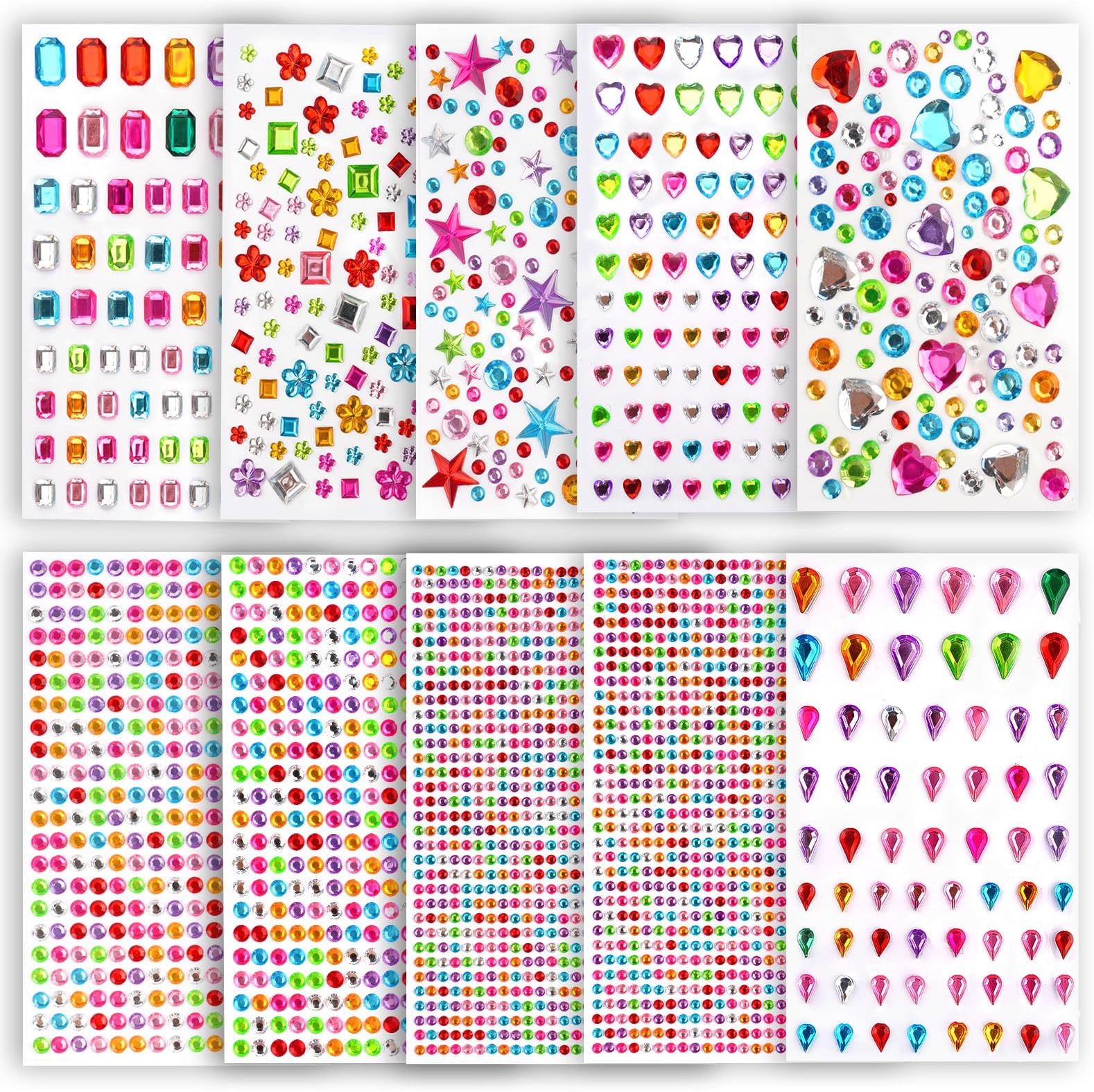 Wow, dieses Glitzersteine-Set ist ein Bastel-Traum! Ganze 2883 Stück selbstklebende Strasssteine in 11 verschiedenen Formen - rund, Herz, Stern, Blume, Tropfen und mehr. Größen von 3mm bis 18mm, für jede Dekoration geeignet.