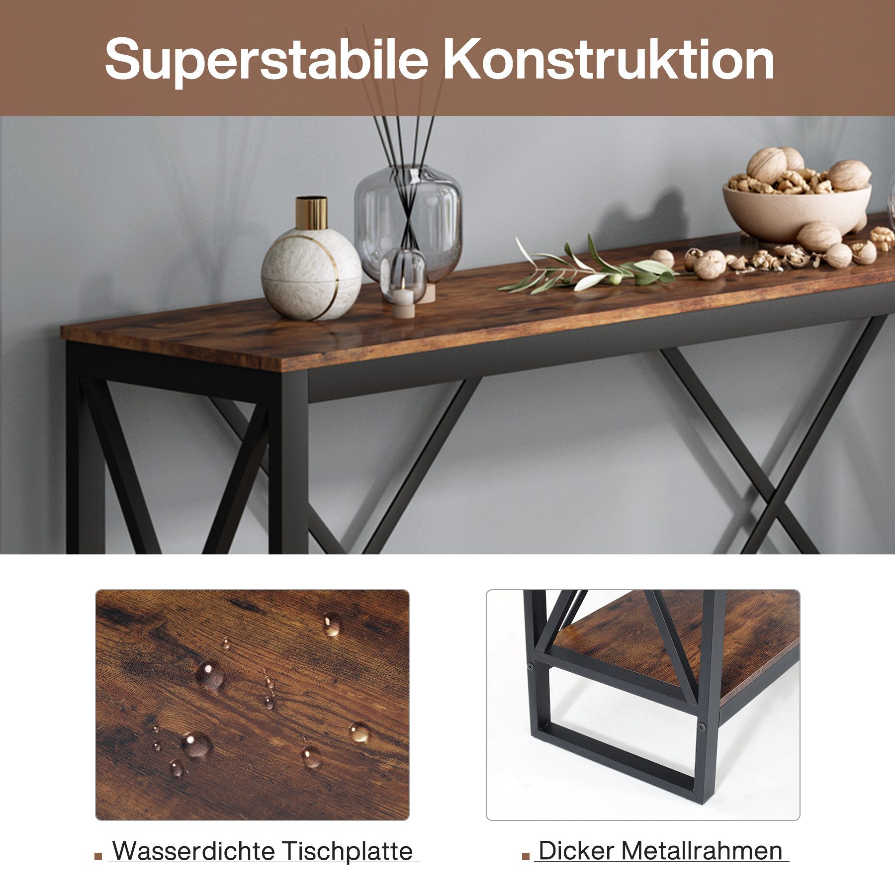 Dieser Konsolentisch im beliebten Farmhouse-Stil bringt rustikalen Charme in dein Zuhause! Mit 105cm Breite passt er perfekt hinter die Couch oder in den Flur. Die zwei offenen Regale bieten praktischen Stauraum für Bücher, Deko oder Alltagskram. Aus robustem MDF gefertigt und mit einer Tragkraft von bis zu 50kg - da macht dir so schnell nichts etwas. Der Zusammenbau ist dank detaillierter Anleitung ganz unkompliziert. Ein echter Hingucker, der sowohl modern als auch gemütlich wirkt!