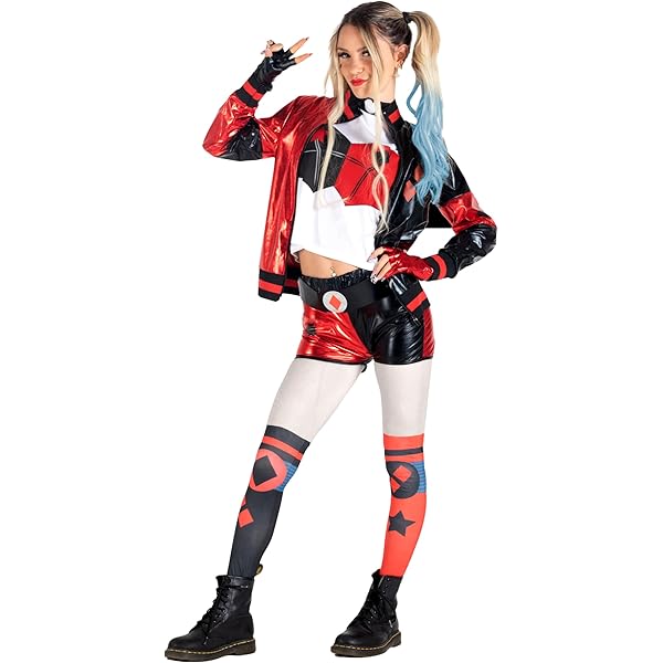 Als Harley Quinn stürmst du jede Party! Dieses komplette 9-teilige Set hat alles, was du für den perfekten Bösewicht-Look brauchst: Jacke, T-Shirt, Shorts, Handschuhe, Gürtel, Perücke, Baseballschläger, Netzstrümpfe und sogar coole Abziehbilder. Die Kleidung aus geschmeidigem Polyester-Spandex-Mix liegt super an und gibt dir volle Bewegungsfreiheit für verrückte Tanzmoves. Das detailreiche Stickmuster auf der Jackenrückseite sieht einfach hammer aus! Perfekt für Halloween, Karneval oder jede andere Themenparty, bei der du auffallen willst. Deine Freunde werden aus dem Staunen nicht mehr rauskommen - versprochen! Einfach anziehen und schon bist du die wildeste Verbrecherin der Stadt.
