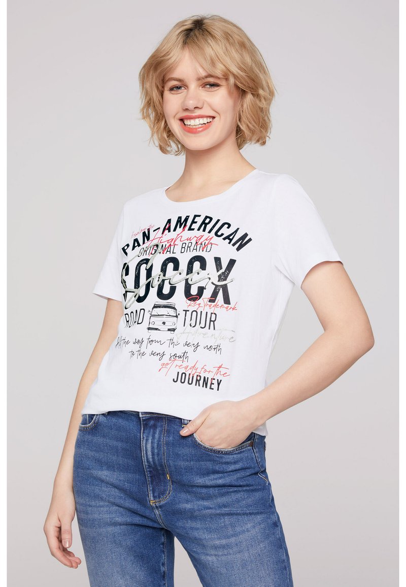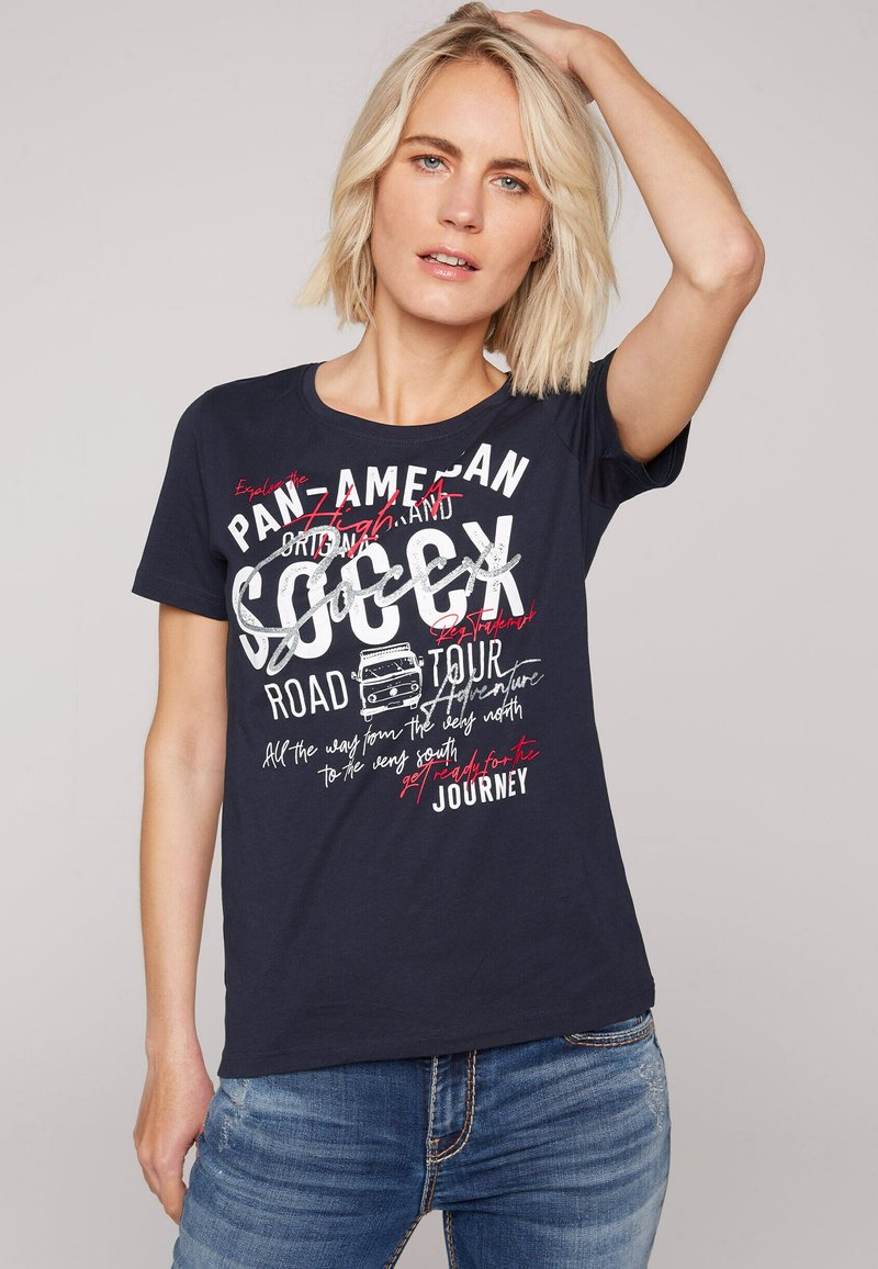 Hey, dieses SOCCX T-Shirt mit dem coolen Glitter-Print ist ja mal richtig stylisch! Das 'Hold Your Vision'-Motiv gibt dem Basic-Shirt richtig Pep. Der klassische Rundhalsausschnitt mit Rippblende sitzt super bequem und der minimal taillierte Schnitt betont deine Figur ohne einzuengen. Die kurzen Ärmel sind perfekt für den Sommer oder zum Layern unter Jacken. Auf der Vorderseite prangt der dekorative Glitter-Print, während die Rückseite schlicht uni bleibt - so ist es nicht zu aufdringlich. Perfekt für den Alltag, zum Shoppen oder für gemütliche Abende. Das Shirt ist in verschiedenen Größen erhältlich - unser Model ist 176 cm groß und trägt Größe S. Einfach ein vielseitiges Basic, das durch den Glitter-Print zum Hingucker wird!