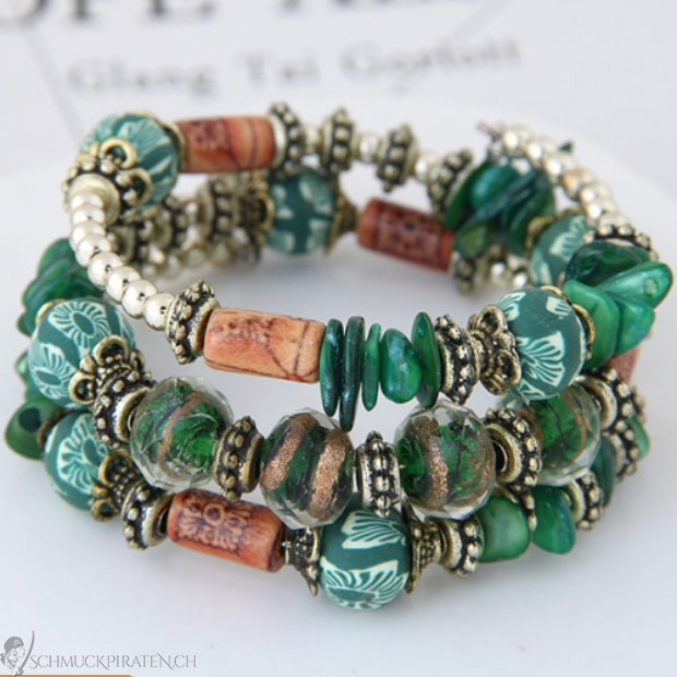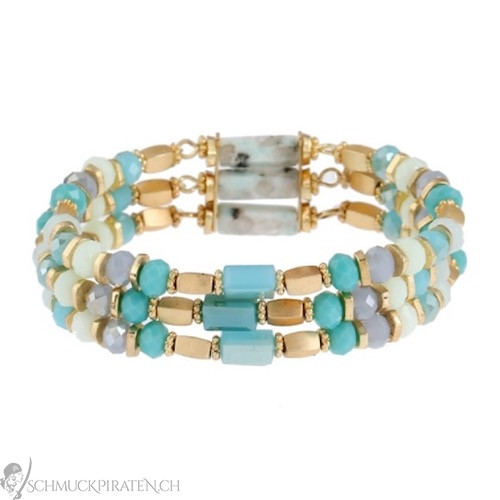 Dieses mehrreihige Armband von Karma ist ein echter Hingucker! Die Kombination aus Metallperlen, Glassteinen, Holz und dekorativen Steinen schafft ein einzigartiges Design.
