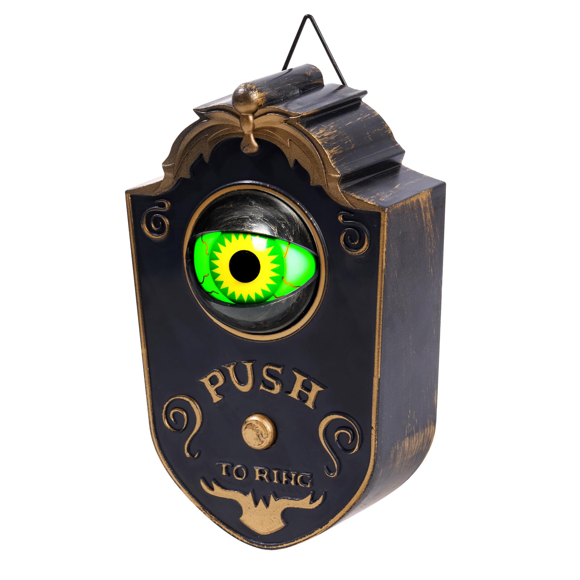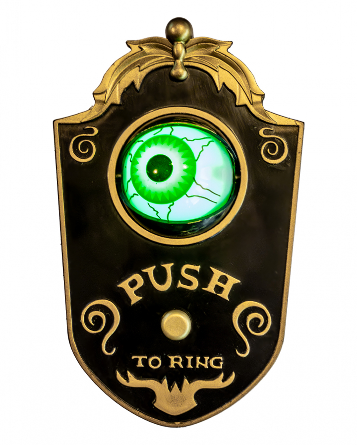 Bereit für Gänsehaut? Diese Halloween-Türklingel mit gruseligen leuchtenden Augen wird deine Besucher das Fürchten lehren! Drückt jemand auf den Knopf, fangen die Augäpfel an sich zu drehen, leuchten grün und unheimliche Geräusche ertönen. Mit 4 verschiedenen Soundeffekten für extra Gruselfaktor. Einfach an der Tür montieren (mit 3 AAA-Batterien betrieben, nicht im Lieferumfang) und schon bist du bereit für die gruseligste Party des Jahres. Perfekt für Halloween, Geisterhaus-Partys oder um deine Nachbarn zu erschrecken!